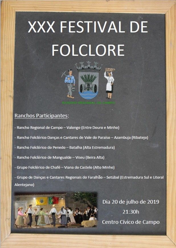 30º Festival de Folclore organizado pelo Rancho Regional de Campo, com inicio às 21h30, no Centro Cívico de Campo.