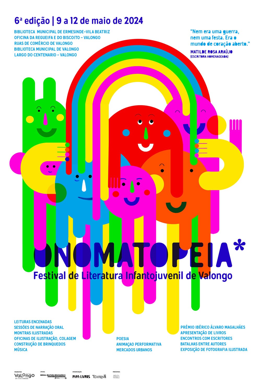 Está tudo a postos para esta que será a sexta edição do Onomatopeia e a segunda edição do Prémio Ibérico de Literatura Infantojuvenil Álvaro Magalhães, cujo vencedor será revelado a 10 de maio. Uma festa de celebração da palavra e da literatura infantojuvenil que decorrerá durante 4 dias, com mais de 120 horas de programação e mais de 40 convidados, entre autores, ilustradores, músicos, artesãos e performers, e para a qual todos estão convidados!