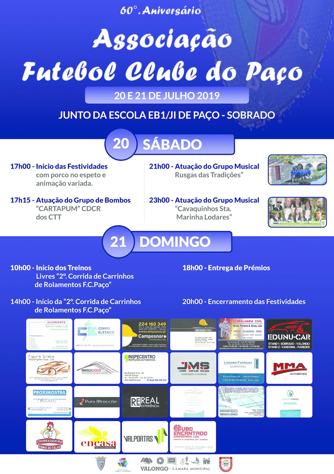 O Futebol Clube do Paço, com o apoio do Município de Valongo, irá comemorar o seu 60.º Aniversário. Esta iniciativa decorrerá junto à EB do Paço, em Sobrado, fazendo parte do programa várias atuações musicais a partir das 17h00 do dia 20 de julho e no dia 21 de julho, a 2.ª Corrida de Carrinhos de Rolamentos, com os treinos a decorrerem pelas 10h00, a prova às 14h00 e a entrega de prémios pelas 18h00.