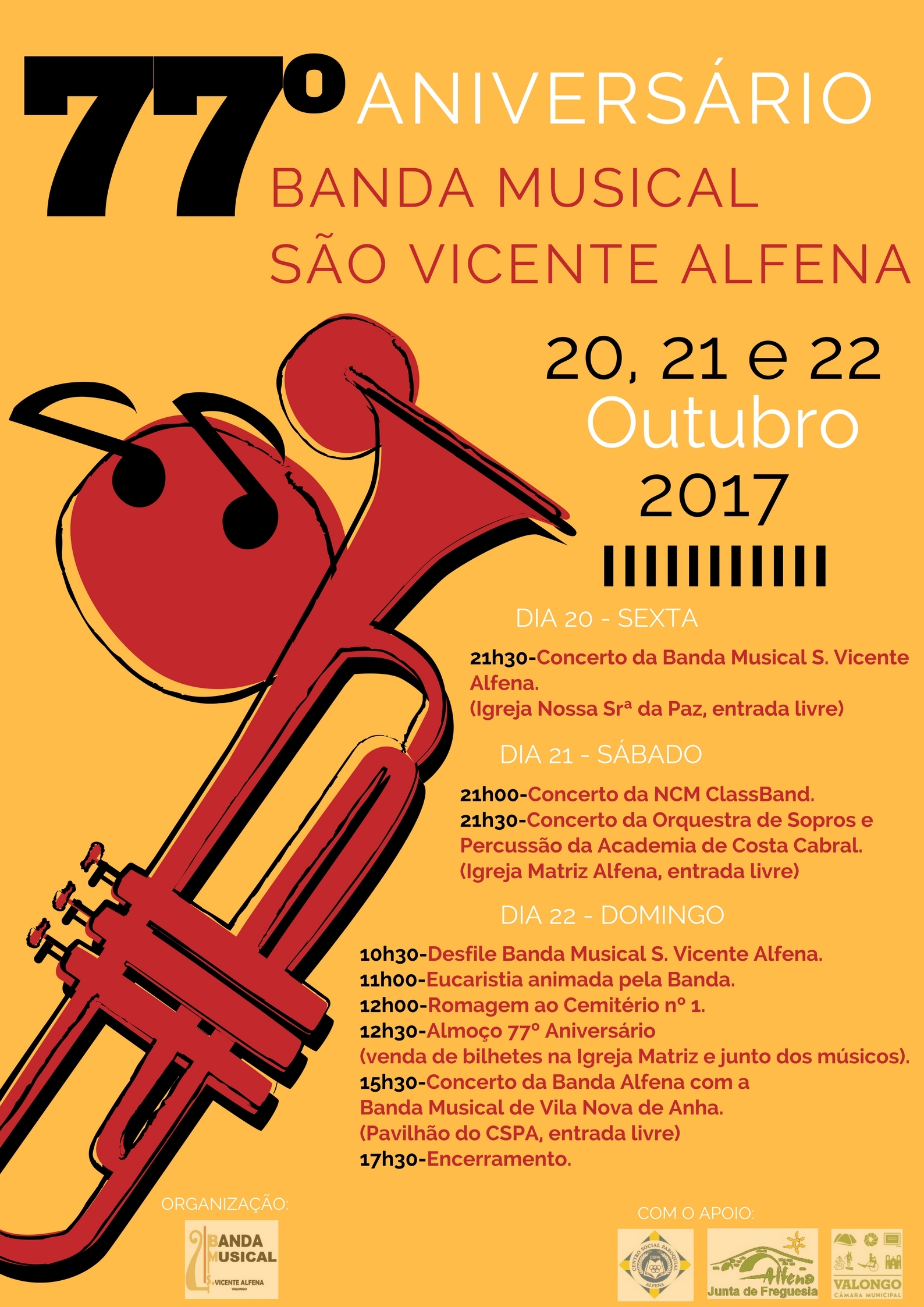 Entre 20 e 22 de outubro, a Banda Musical de São Vicente de Alfena comemora o seu 77.º aniversário com um vasto conjunto de iniciativas. A programação inclui concertos na sexta-feira e no sábado. No domingo realiza-se o desfile da banda, um almoço comemorativo e mais um concerto dos aniversariantes.