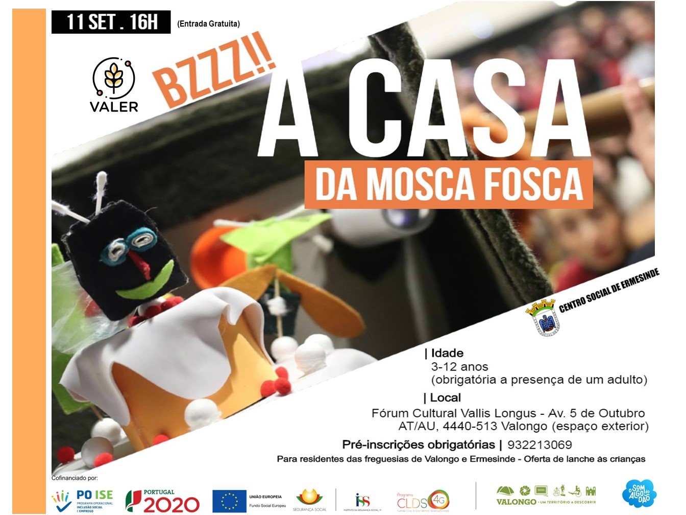 O CLDS4G projeto VALER, coordenado pelo Centro Social de Ermesinde, vai realizar uma atividade dirigida a famílias carenciadas com crianças a cargo, residentes nas freguesias de Valongo e Ermesinde. Trata-se da história cantada "A Casa da Mosca Fosca" e terá lugar no Fórum Cultural Vallis Longus, em Valongo, no dia 1 de setembro, pelas 16h00.