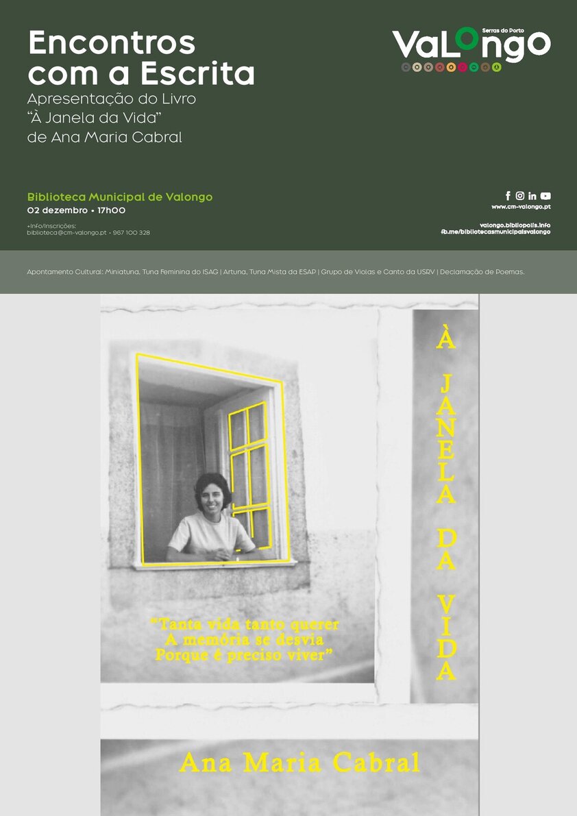 A Biblioteca Municipal de Valongo acolhe no próximo dia 02 de dezembro, pelas 17h00, mais uma sessão da iniciativa "Encontros com a Escrita". A convidada é Ana Maria Cabral que fará a apresentação do livro “À Janela da Vida”.