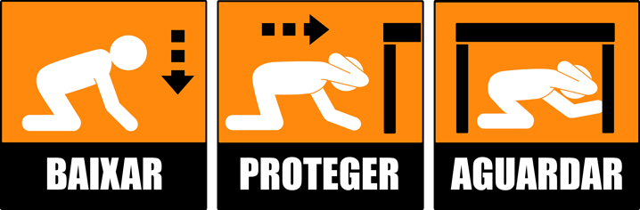 Durante o exercício, os cidadãos devem BAIXAR-SE sobre os joelhos, uma posição que evita cair em caso de ocorrência de sismo, (também designado por terramoto ou tremor de terra). Deverão PROTEGER a cabeça e o pescoço com os braços e as mãos, procurando abrigar-se, se possível colocando-se sob uma mesa resistente e segurar-se firmemente a ela. Por fim, AGUARDAR até que a ‘terra pare de tremer’.