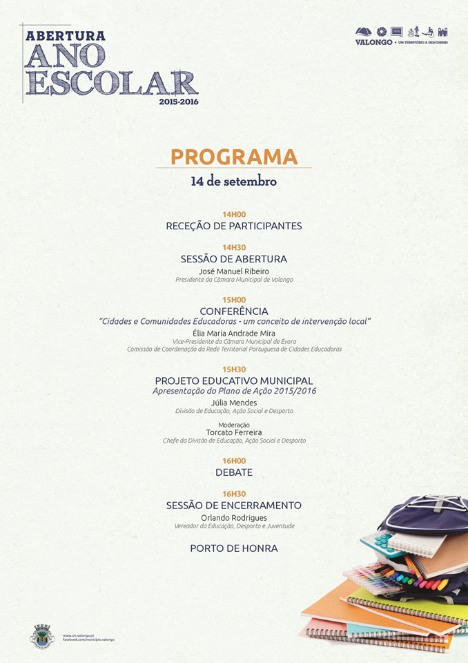 A Sessão de Abertura do Ano Escolar terá lugar no próximo dia 14 de setembro, pelas 14h00, no Auditório António Macedo, em Valongo.