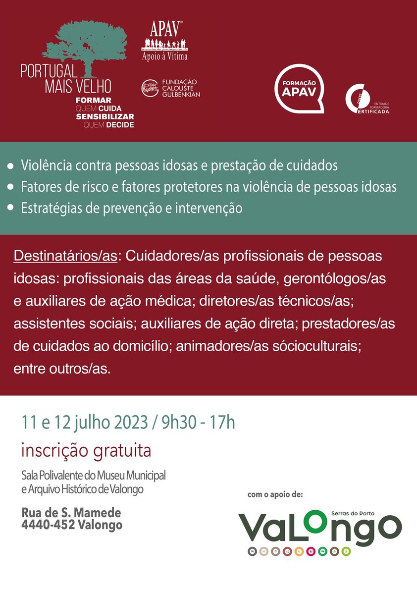 O Primeiro Passo – Gabinete de apoio à vítima, um projeto da Câmara Municipal de Valongo, vai, em colaboração com a Associação Portuguesa de Apoio à Vítima (APAV), promover uma ação de formação "Violência contra pessoas idosas e a prestação de cuidados profissionais", no âmbito do projeto Portugal Mais Velho – Formar quem Cuida, Sensibilizar quem Decide, a realizar na Sala Polivalente do Museu Municipal e Arquivo Histórico de Valongo, nos dias 11 e 12 de julho de 2023, das 9h30 às 17h00