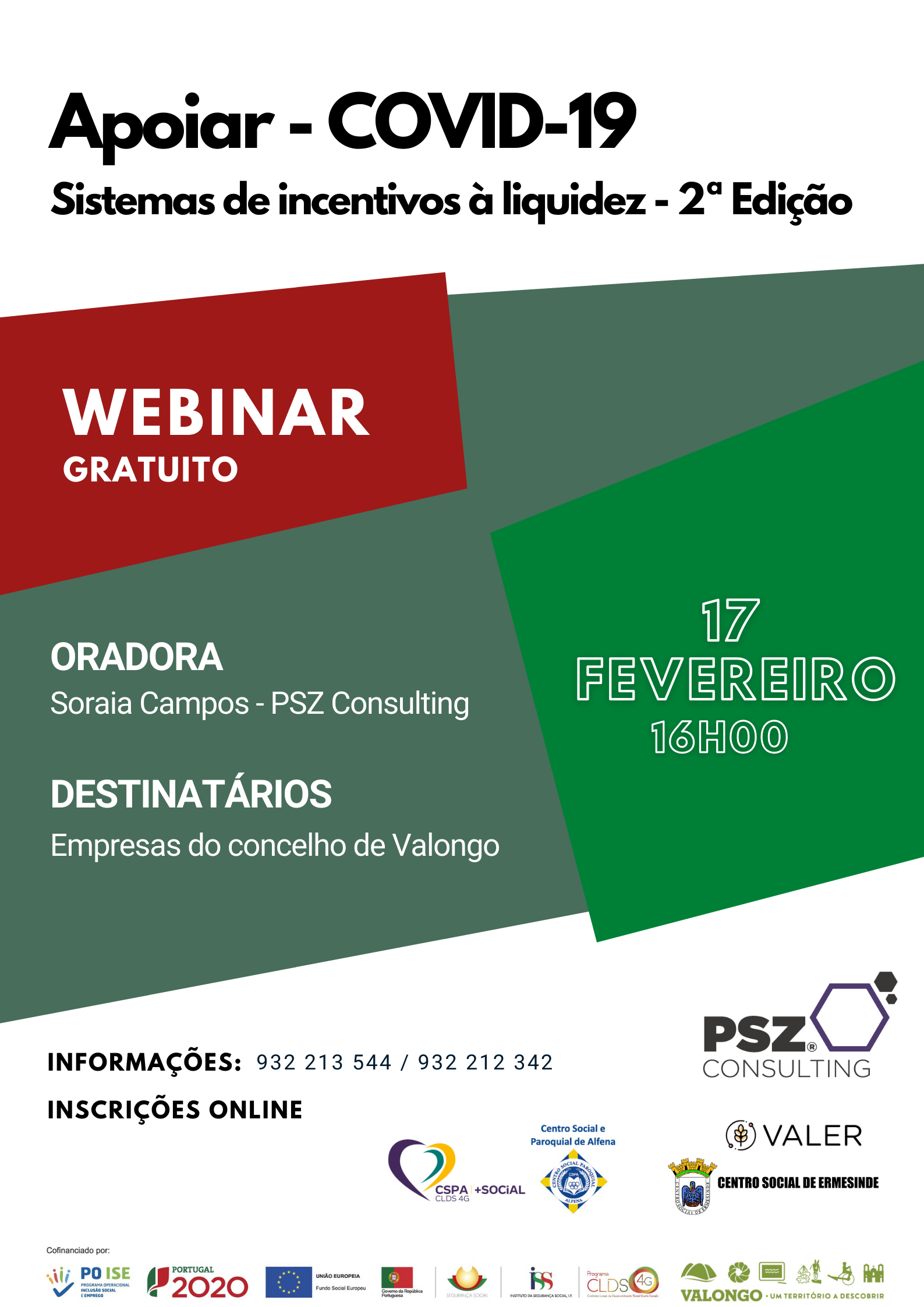 A PSZ Consulting em parceria com projeto +Social do Centro Social e Paroquial de Alfena e do projeto VALER do Centro Social de Ermesinde (Programas CLDS4G promovidos pelo Município de Valongo) vai promover no próximo dia 17 de fevereiro, pelas 16h, um Webinar destinado aos empresários do concelho de Valongo.