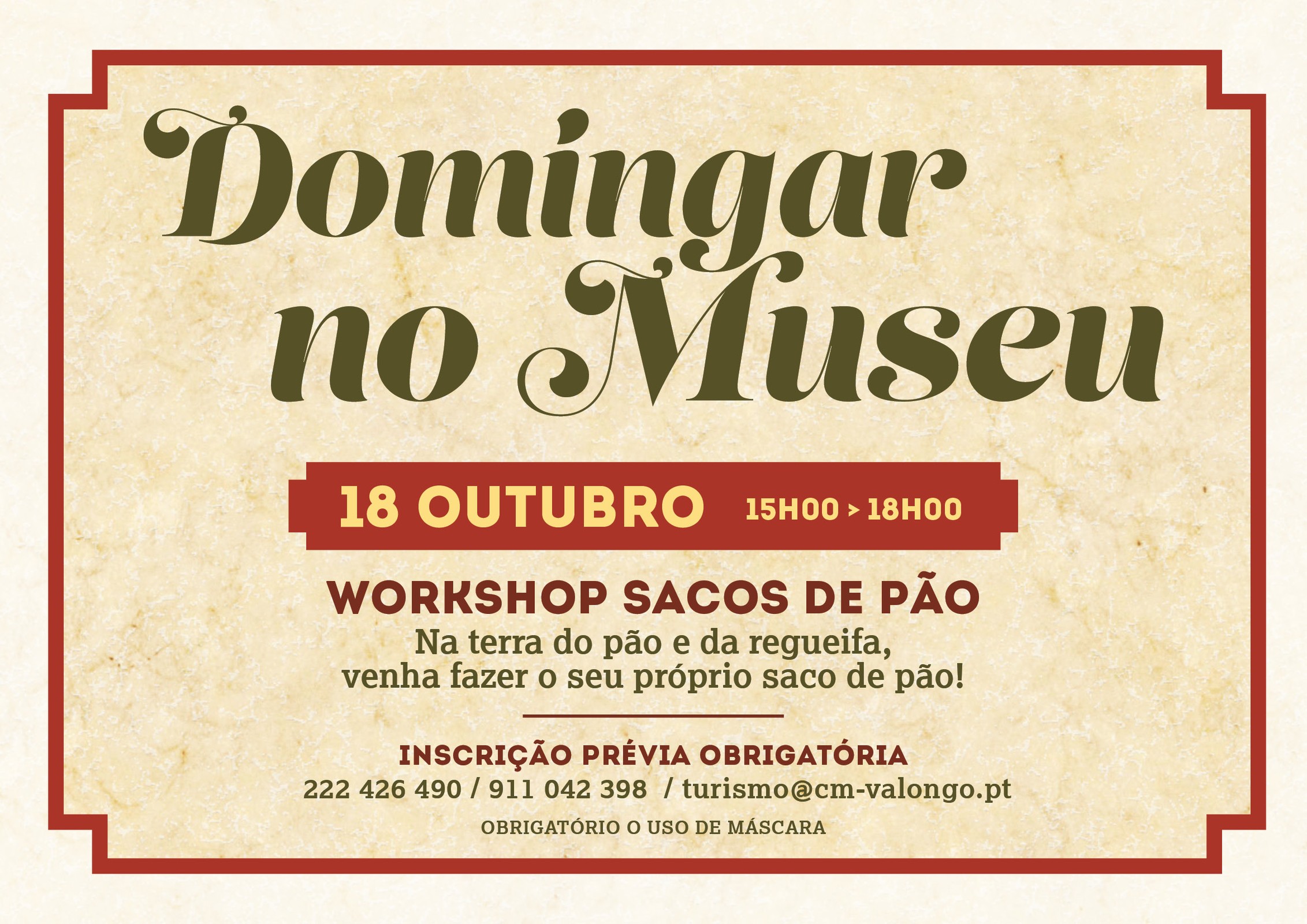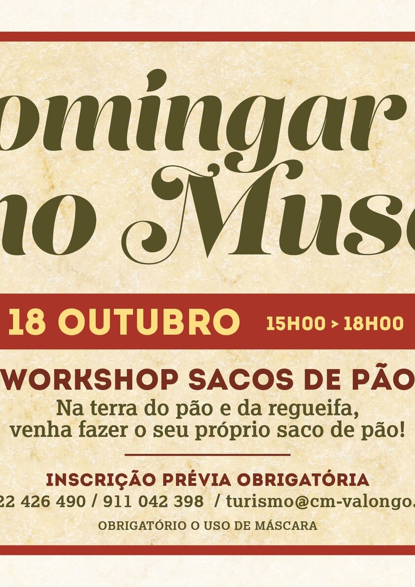 Porque Valongo é tradicionalmente conhecido como a Terra do Pão e do Biscoito e porque, anualmente, a 16 de outubro se comemora o Dia Mundial do Pão, no domingo, dia 18 de outubro, entre as 15h00 e as 18h00, estão todos convidados a juntarem-se a nós para produzirem o vosso próprio saco de pão, contando com o apoio da artesã do concelho Luz Couto.