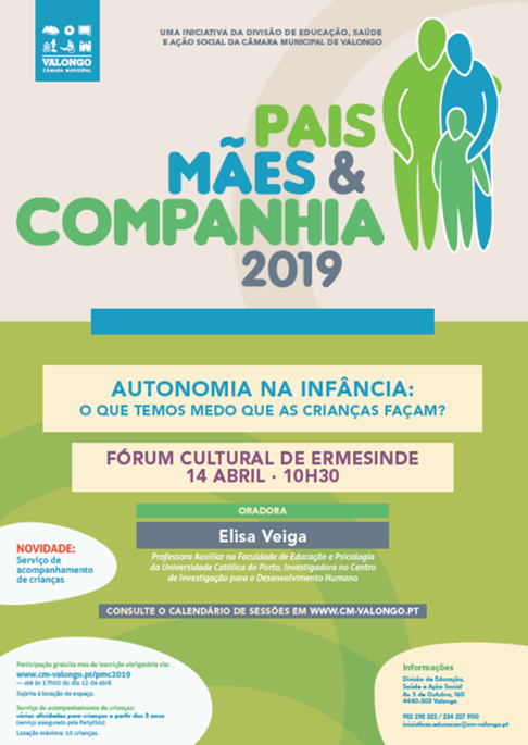 No dia 14 de abril vamos falar de autonomia das crianças, com o tema “Autonomia na Infância: o que temos medo que as crianças façam?”. A oradora convidada é Elisa Veiga, Professora Auxiliar na Faculdade de Educação e Psicologia da Universidade Católica do Porto e ainda Investigadora no Centro de Investigação para o Desenvolvimento Humano. A sessão decorrerá, como habitualmente, pelas 10h30, no Fórum Cultural de Ermesinde.