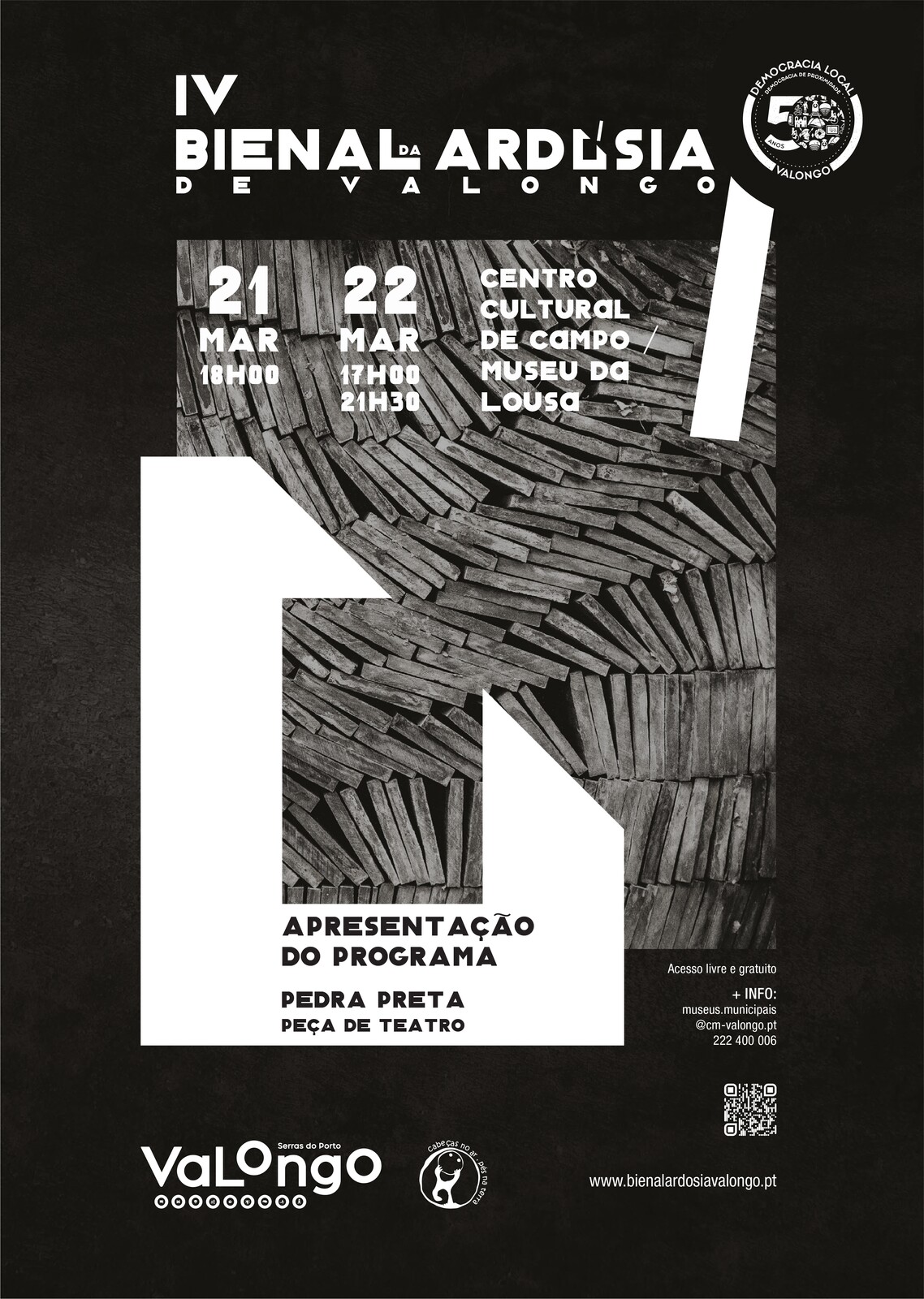 2025 é o ano de realização da IV Bienal da Ardósia de Valongo e o pontapé de saída é já no dia 21 de março, às 18h00, no Centro Cultural de Campo/Museu da Lousa, com a apresentação do programa desta edição, seguida da peça de teatro "Pedra Negra", a cargo da Associação Cultural Cabeças no Ar e Pés na Terra. No dia seguinte, 22 de março, o programa repete-se às 17h00 e às 21h30.