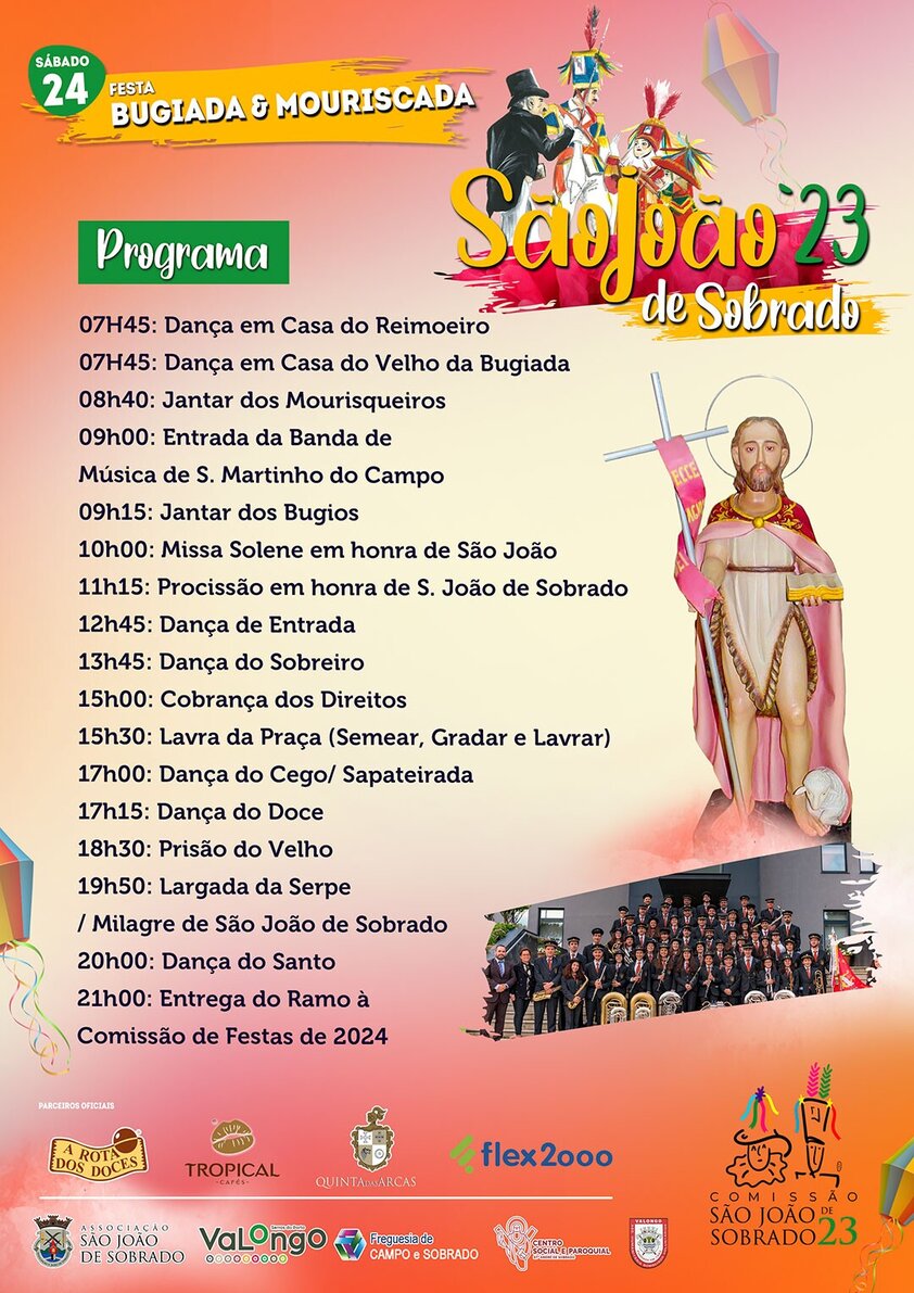 Para além da Bugiada e Mouriscada que acontece a 24 de junho, as Festas de S. João de Sobrado têm muito mais para oferecer. A partir do dia 16 há um vasto e diversificado programa cultural que conta com a presença, entre outros, de Xutos e Pontapés e Tony Carreira. Consulte o cartaz completo aqui.