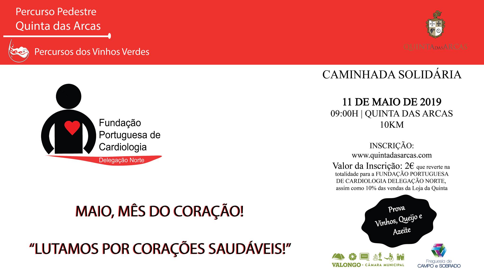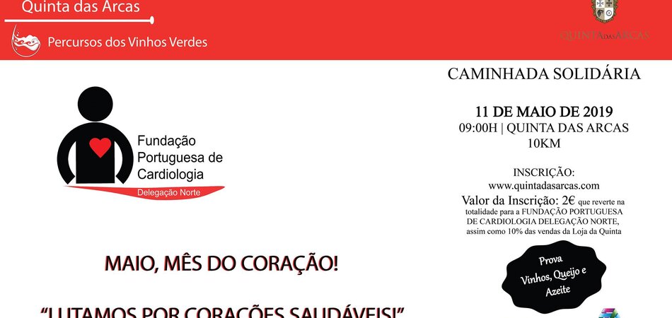A próxima caminhada no Percurso Pedestre da Quinta das Arcas realiza-se dia 11 de Maio em parceria com a Fundação Portuguesa de Cardiologia - Norte, no âmbito do mês de Maio - mês do coração. Pretendse-se com esta iniciativa sensibilizar para a adopção de comportamentos saudáveis, pequenos gestos do dia-a-dia podem fazer a diferença de uma vida!