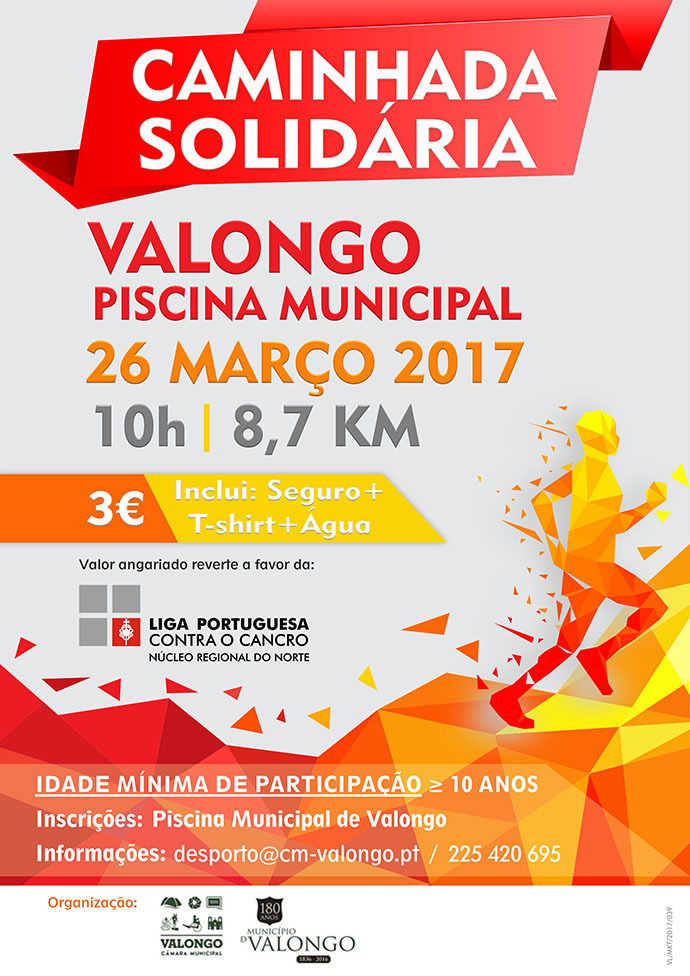 O Município de Valongo vai organizar uma Caminhada Solidária na freguesia de Valongo, no próximo dia 26 de Março de 2017, a partir das 10h00, com o intuito de apoiar a Liga Portuguesa Contra o Cancro - Núcleo Regional do Norte (LPCC-NRN), uma entidade de referência nacional no apoio ao doente oncológico e família, na promoção da educação para a saúde, na prevenção do cancro, no estímulo à formação e investigação em oncologia.