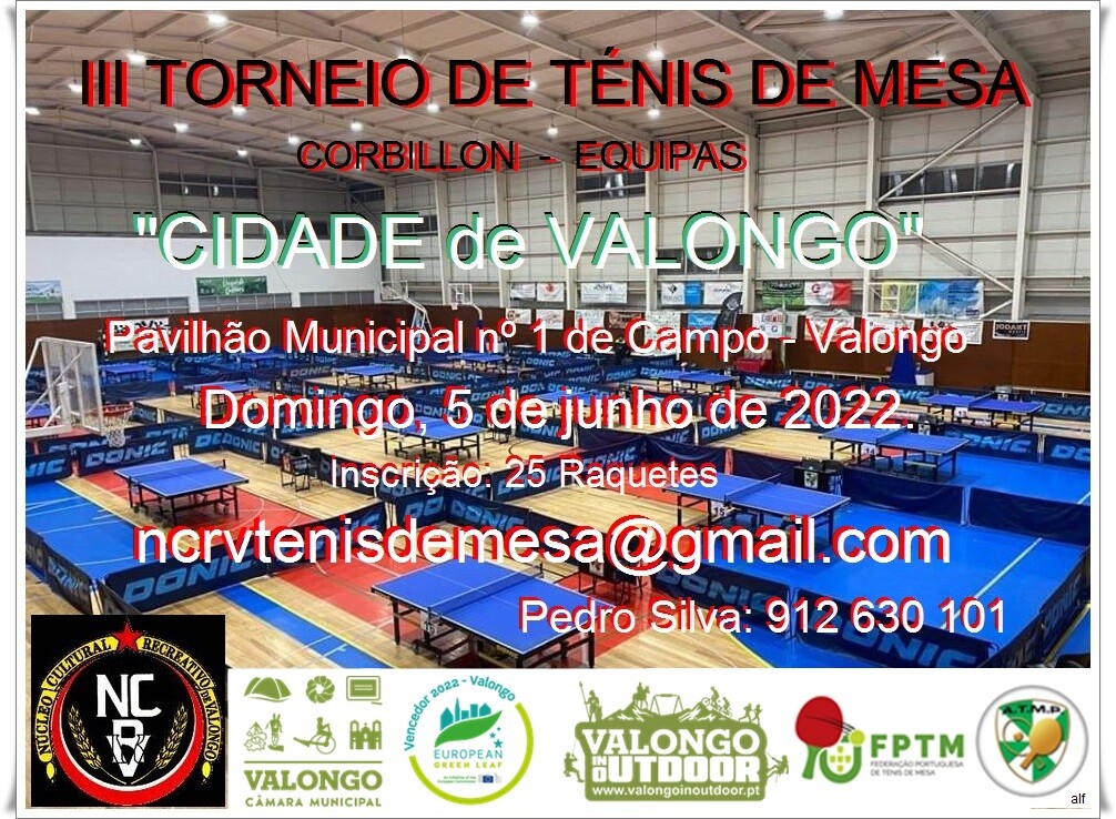O Núcleo Cultural e Recreativo de Valongo vai realizar, com o apoio da Câmara Municipal de Valongo, dois Torneios de Ténis de Mesa, no fim de semana de 4 e 5 de junho 2022, no Pavilhão Municipal n.º 1 de Campo.
