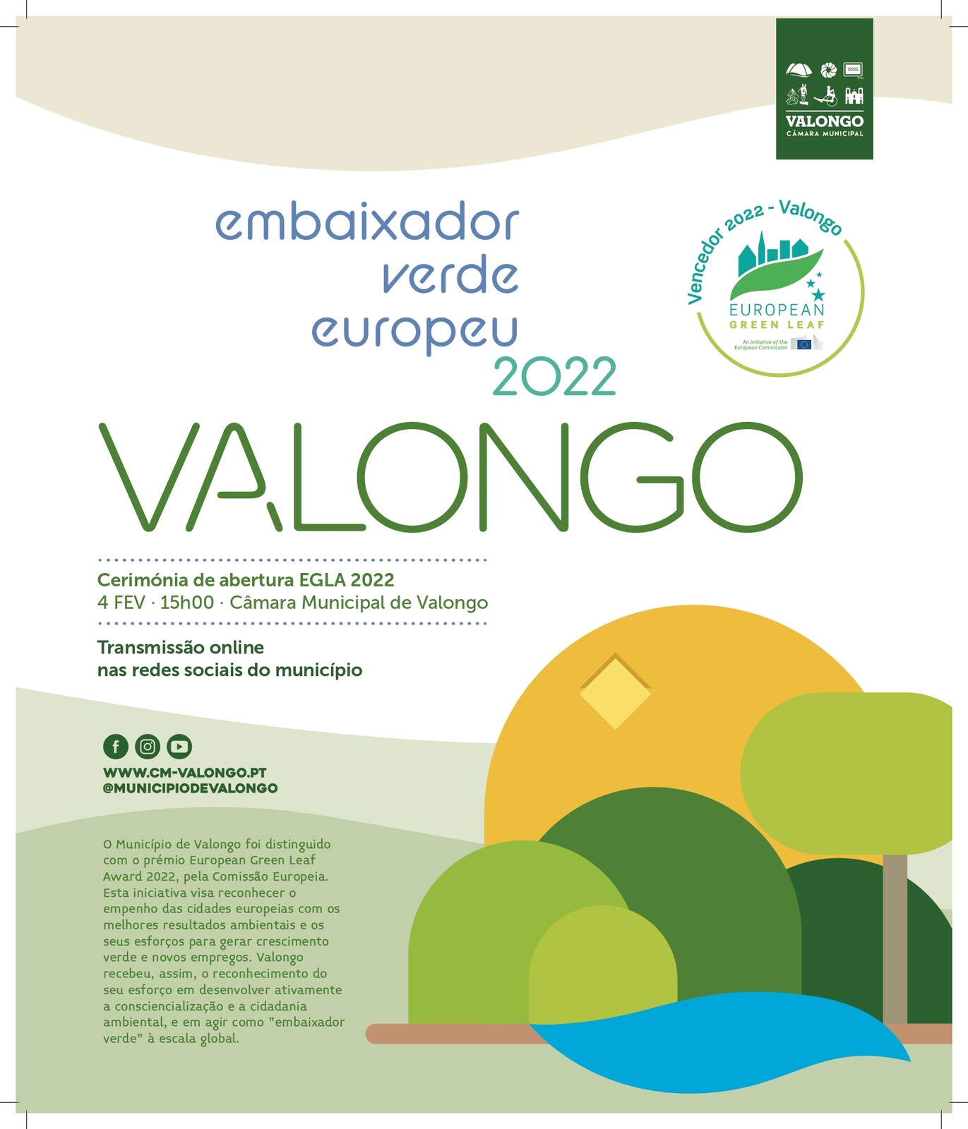 A Cerimónia de Abertura Oficial – Valongo Folha Verde Europeia 2022 (EGLA -European Green Leaf Award 2022) realiza-se no dia 4 de fevereiro, pelas 15h00, na entrada dos Paços do Concelho de Valongo.