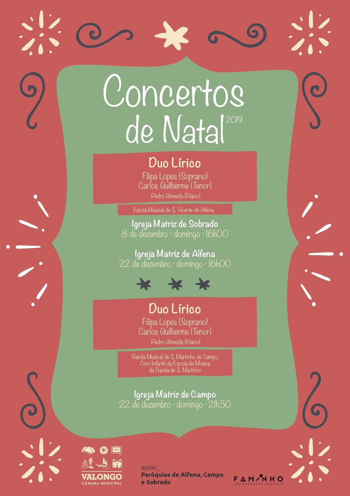 No presente ano, os Concertos que terão lugar nas Igrejas Matrizes de Sobrado e Alfena contarão com a atuação da Banda Musical de S. Vicente de Alfena. Já a Igreja Matriz de Campo receberá a Banda Musical de S. Martinho de Campo e o Coro Infantil da sua Escola de Música.