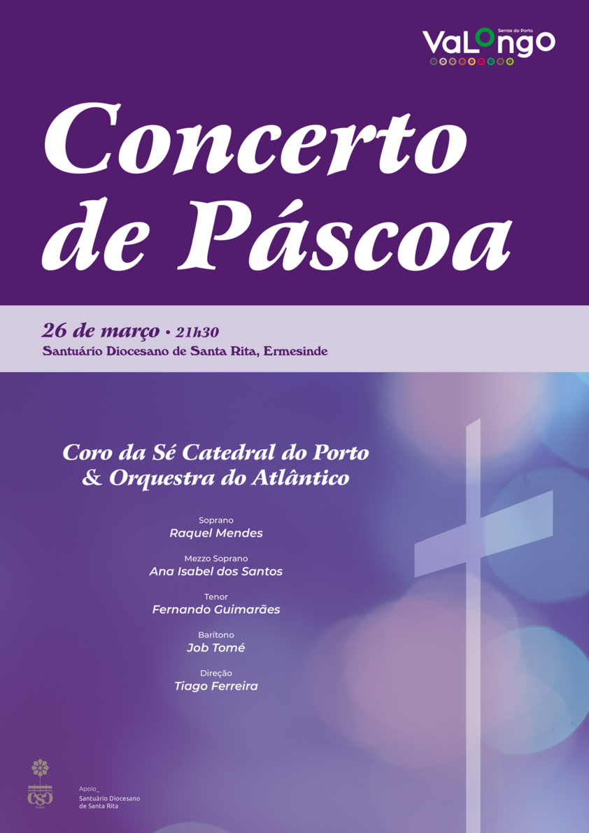 Cumprindo uma tradição de longos anos, o Município de Valongo vai promover mais uma edição do Concerto de Páscoa. No dia 26 de março, pelas 21h30, o Santuário Diocesano de Santa Rita, em Ermesinde, recebe o Coro da Sé Catedral do Porto acompanhado pela Orquestra do Atlântico para um concerto único e imperdível. A direção do concerto estará a cargo de Tiago Ferreira e contará com as participações de Raquel Mendes (soprano), Ana Isabel dos Santos (mezzo soprano), Fernando Guimarães (tenor) e Job Tomé (barítono).