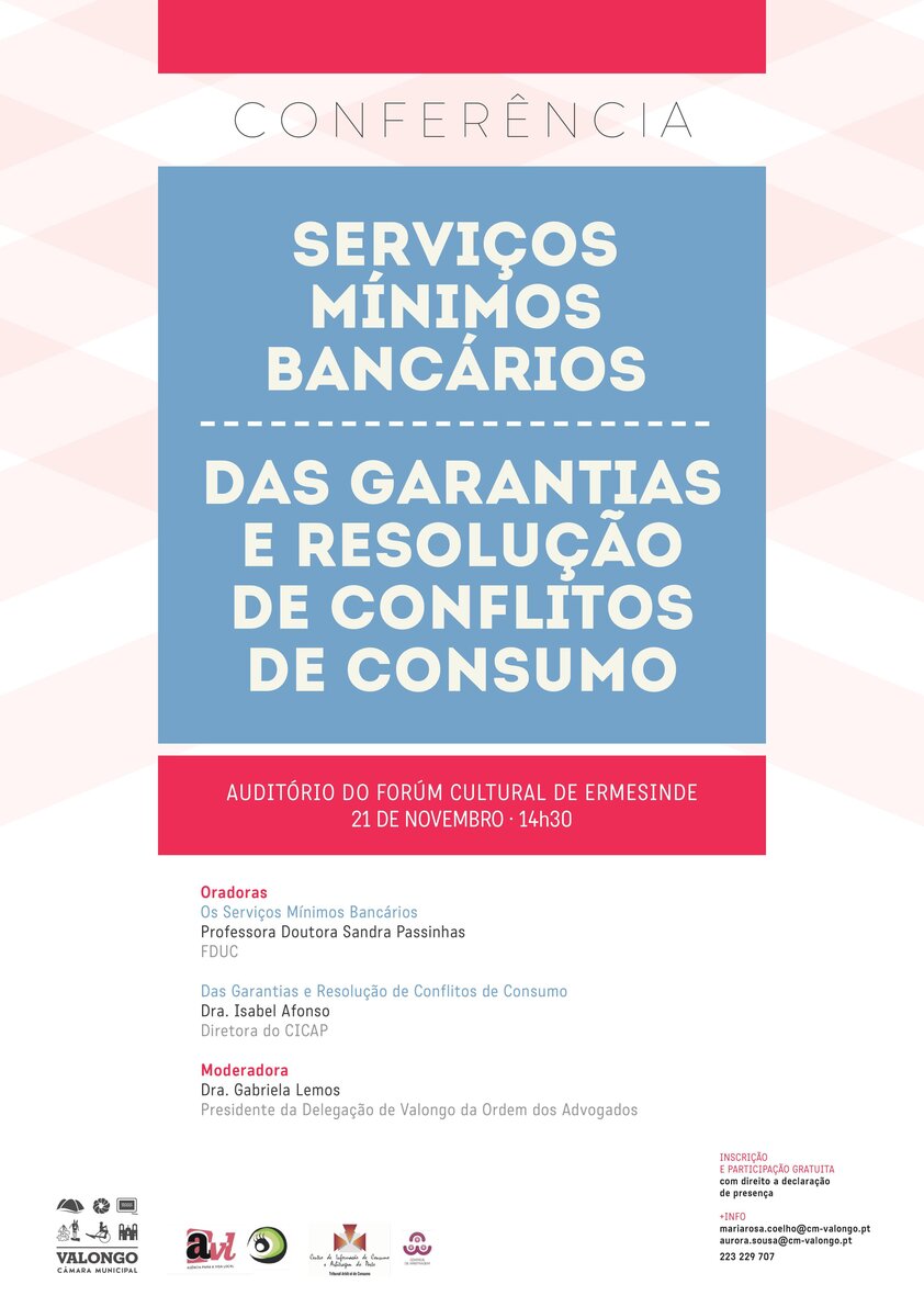 A Câmara Municipal de Valongo promove a conferência “Serviços Mínimos Bancários, das Garantias e Resolução de Conflitos de Consumo” que se realiza no Auditório do Fórum Cultural de Ermesinde no dia 21 de novembro, pelas 14h30m.