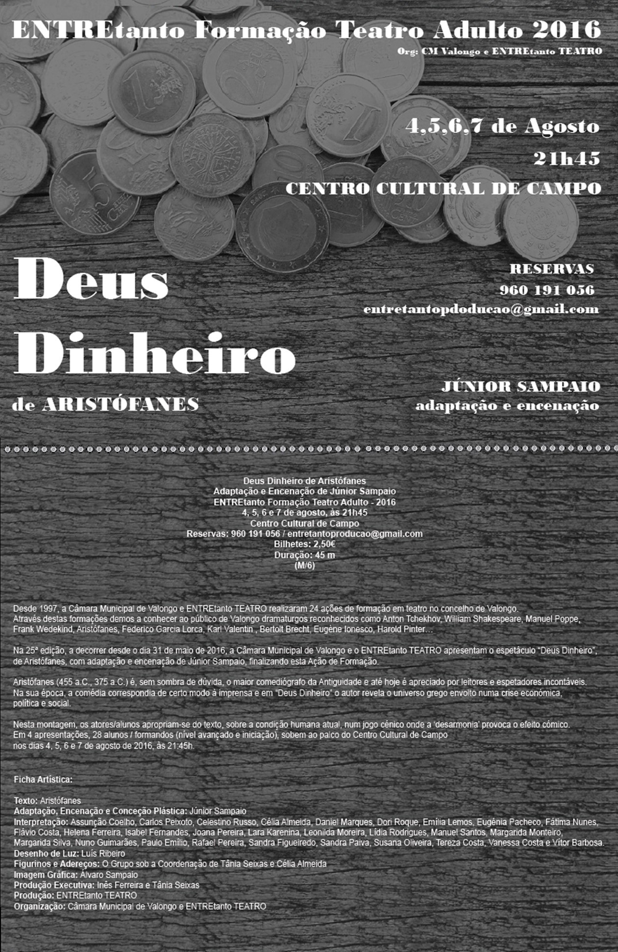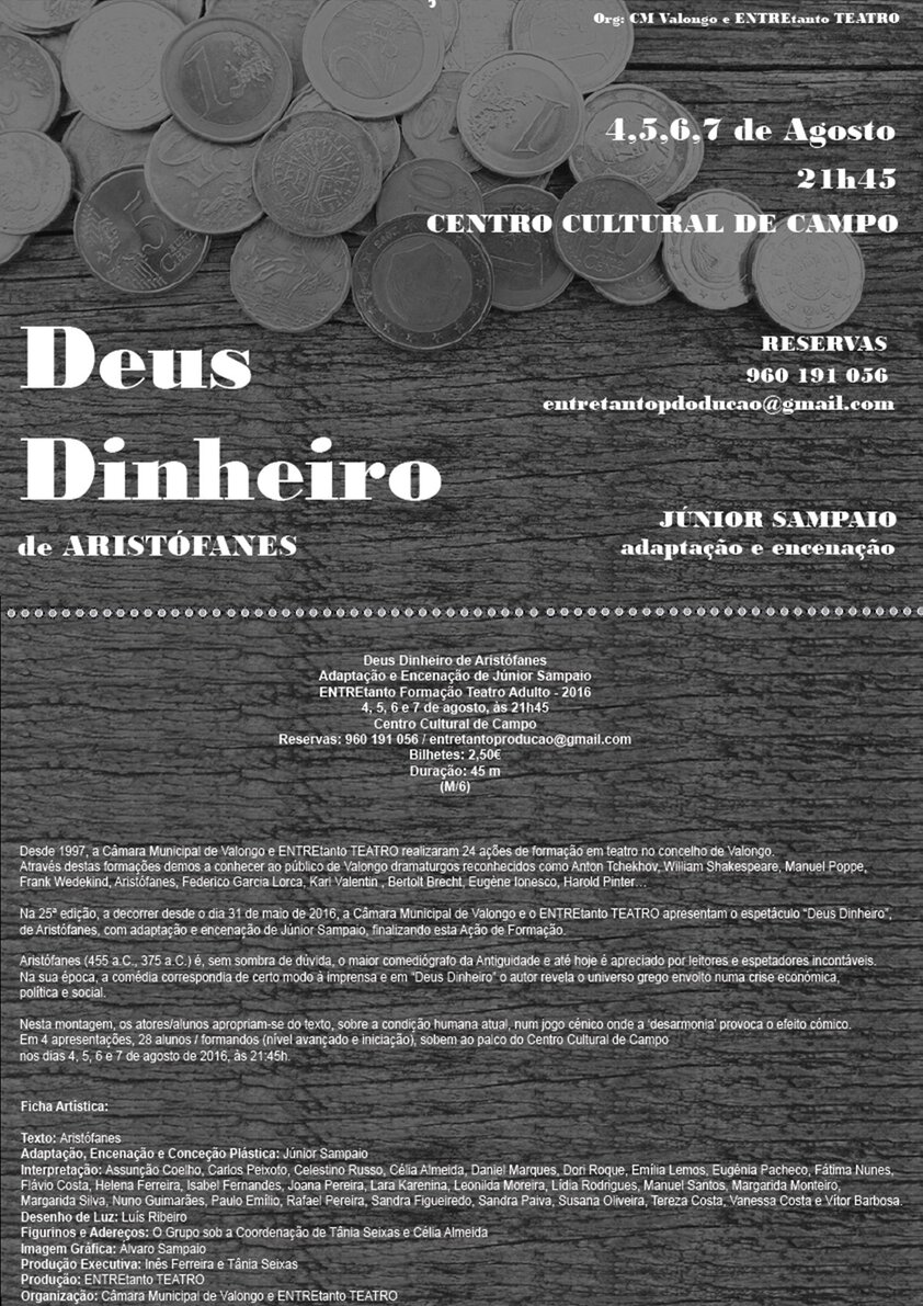 Na 25ª edição, a decorrer desde o dia 31 de maio de 2016, a Câmara Municipal de Valongo e o ENTREtanto TEATRO apresentam o espetáculo “Deus Dinheiro”, de Aristófanes, com adaptação e encenação de Júnior Sampaio, finalizando esta Ação de Formação.