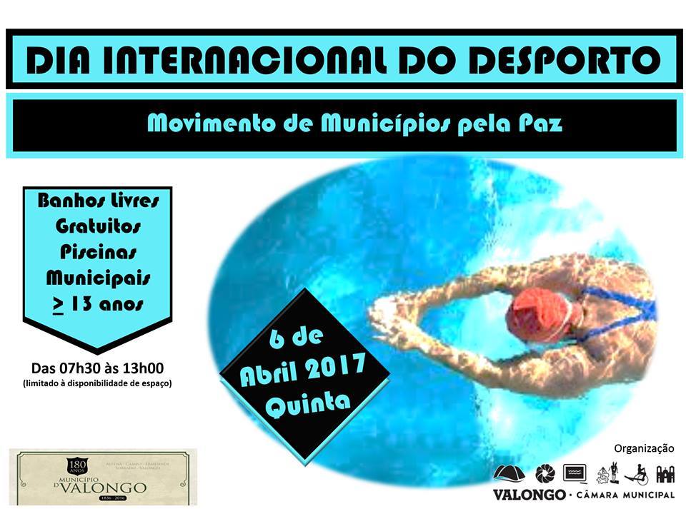 No âmbito do programa de atividades de "Gondomar - Cidade Europeia do Desporto de 2017" e a convite da Câmara Municipal do Seixal, o município de Valongo associa-se à primeira iniciativa do Movimento Municípios pela Paz, que pretende assinalar o Dia Internacional do Desporto ao serviço do Desenvolvimento e da Paz, através da realização de uma atividade desportiva, proporcionando o acesso gratuito às piscinas municipais, na modalidade de banhos livres, dirigida à população em geral (maiores de 13 anos).