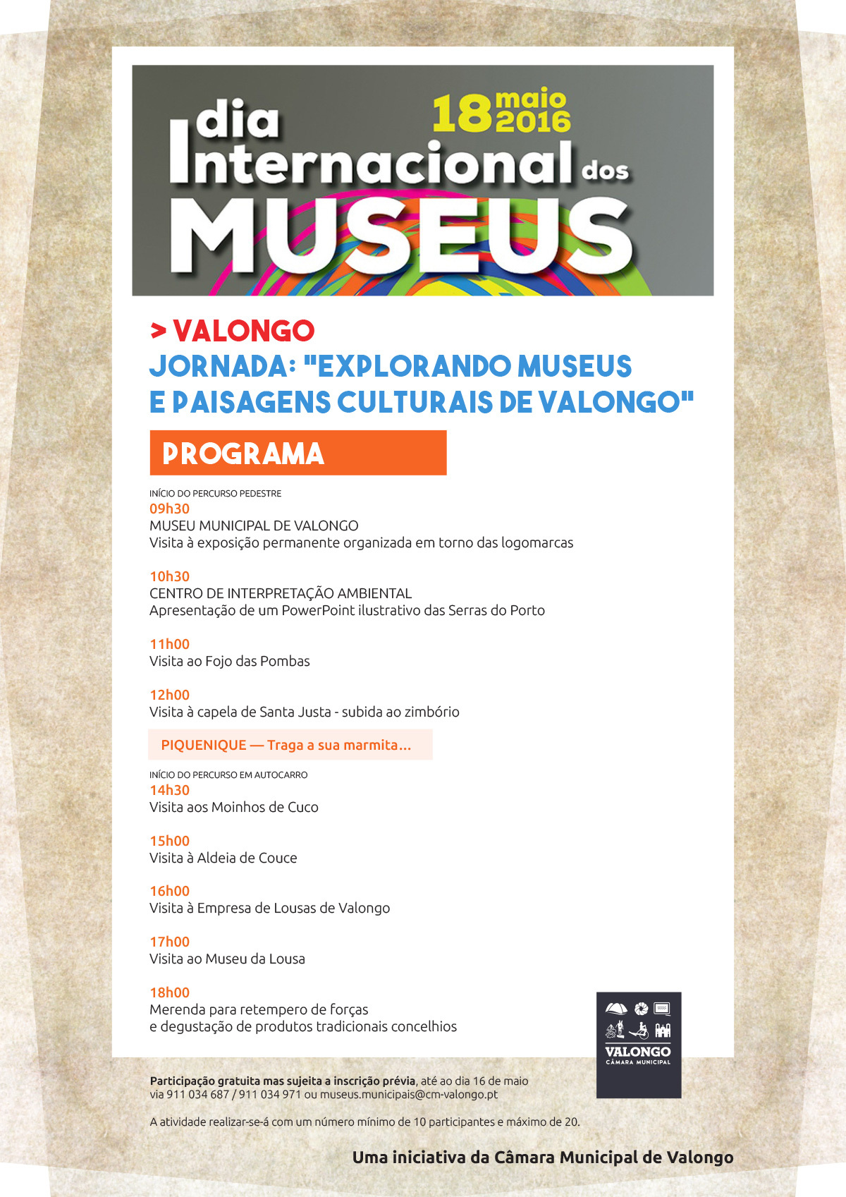 No âmbito das comemorações do Dia Internacional dos Museus, a Câmara Municipal de Valongo, através dos serviços da Cultura e do Ambiente, vai levar a cabo uma jornada intitulada "Explorando Museus e Paisagens Culturais de Valongo" no dia 18 de maio. A participação nesta atividade é gratuita mas sujeita a inscrição prévia até ao dia 16 de maio através dos tels. 911 034 687, 911 034 971 ou email para museus.municipais@cm-valongo.pt