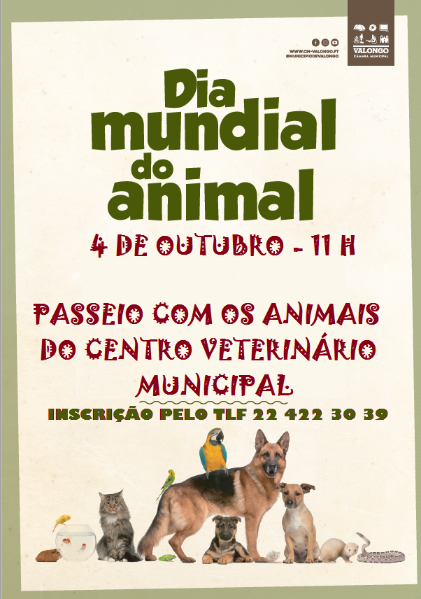 O Município de Valongo vai pelo 20.º ano consecutivo celebrar o Dia do Animal. Este ano, vai realizar-se um passeio com os animais do Centro Veterinário Municipal, com a possibilidade dos mesmos serem adotados no final.