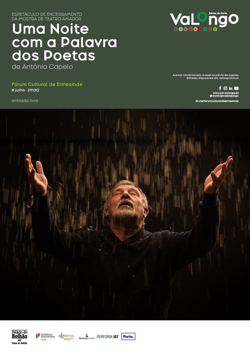 Depois da exibição dos espetáculos dos grupos amadores, a Mostra de Teatro Amador do Concelho de Valongo chega ao fim com a apresentação da peça "Uma noite com a palavra dos poetas", de António Capelo. Este espetáculo terá lugar no dia 08 de julho, pelas 21h30, no Fórum Cultural de Ermesinde.