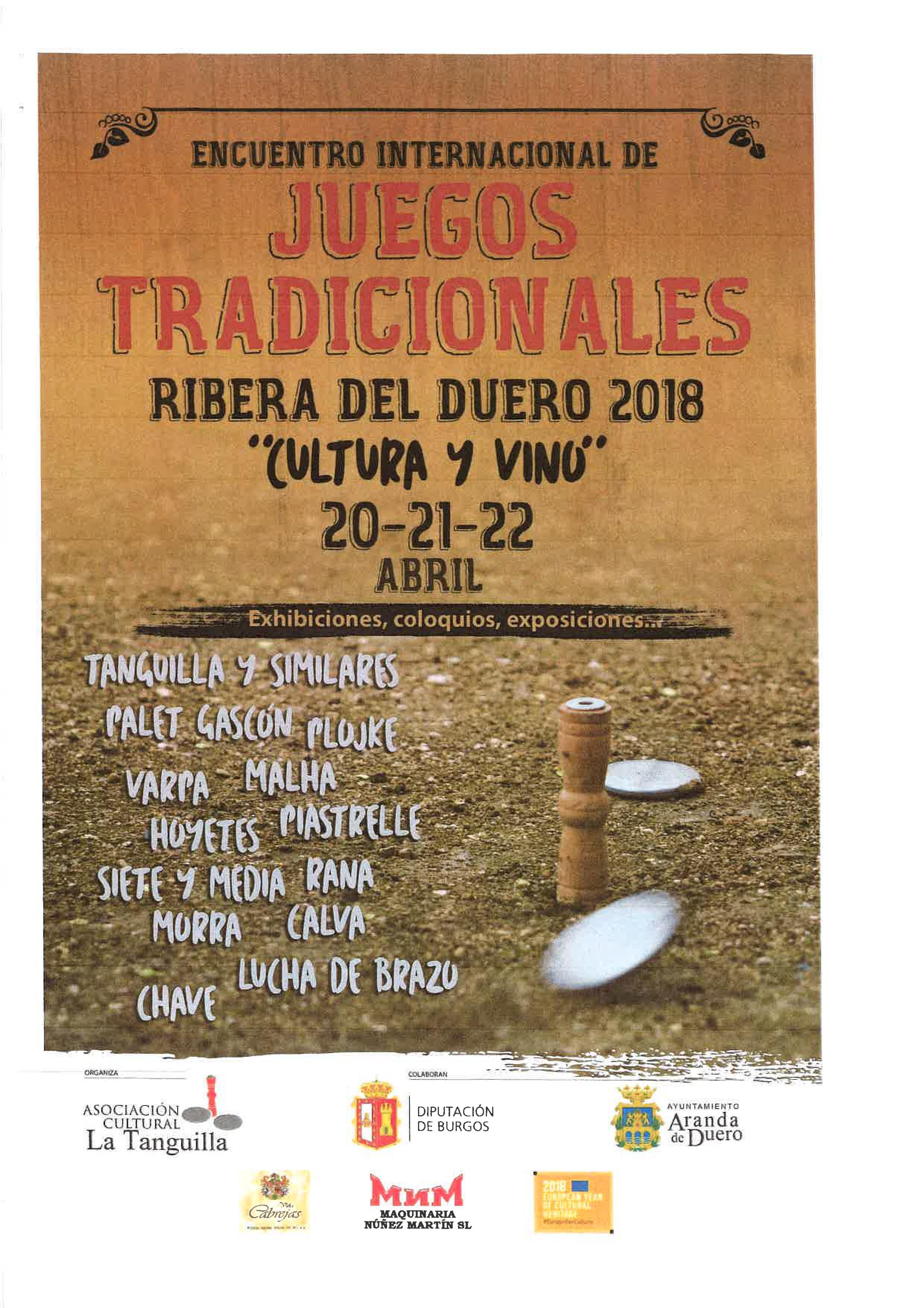 A Associação Cultural La Tanguilla (Espanha) convidou a Associação das Coletividades do Concelho de Valongo - ACCV, a participar no Encontro Internacional de Jogos Tradicionais - Ribera Del Duero 2018, a decorrer em Aranda de Duero (Burgos - Espanha), nos dias 19, 20, 21 e 22 abril, onde decorrerão exibições, colóquios, exposições e dinamização dos Jogos Tradicionais, sendo esta participação muito importante para a preparação das equipas que nos irão representar no Campeonato Internacional, a decorrer em 2020, em Lisboa.
