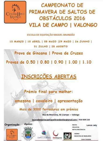 A 3ª Fase do Campeonato de Primavera de Saltos de Obstáculos realiza-se no dia 26 de junho, pelas 9h00, na Vila de Campo, em Valongo. No final das provas realizar-se-á uma grandiosa corrida de Póneis!