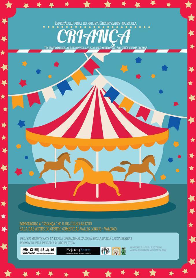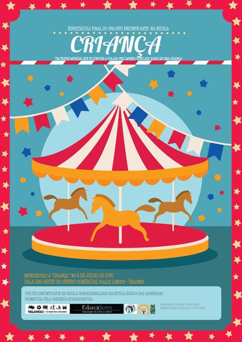 «Criança» é o espetáculo final do projeto Encontr´ARTE na Escola, que será apresentado ao público no dia 9 de julho, domingo, pelas 17h00, na Sala das Artes do C.C.C. Vallis Longus. Esta peça de teatro musical convida o público a viajar pelo mundo visto pelos olhos de uma criança.