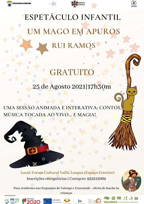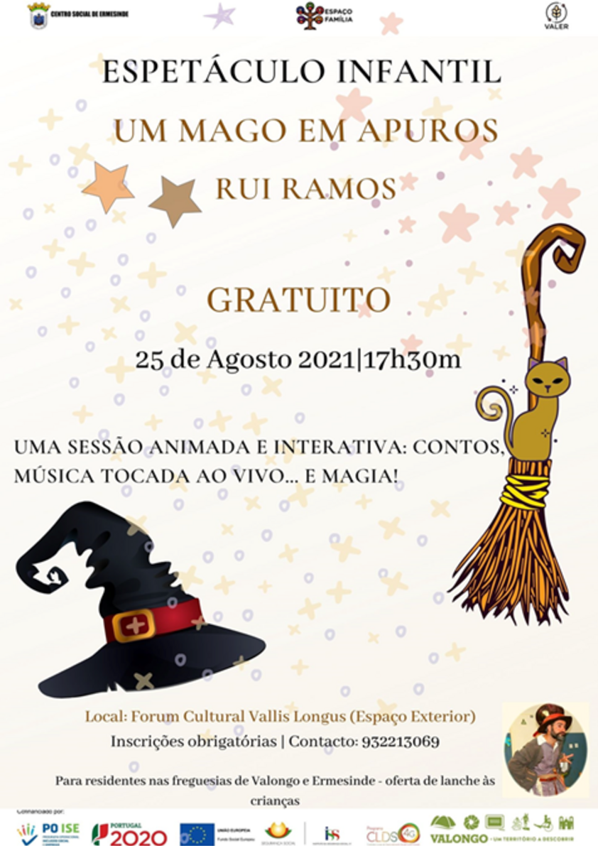No próximo dia 25 de agosto, pelas 17h30, decorrerá no terraço exterior do Fórum Vallis Longus, o espetáculo infantil "Um Mago em apuros", com Rui Ramos. Trata-se de uma iniciativa do Projeto CLDS 4G /VaLer destinada a crianças e jovens residentes nas freguesias de Valongo e Ermesinde e promete muita animação, magia e música ao vivo. E haverá ainda um lanche para todas as crianças.