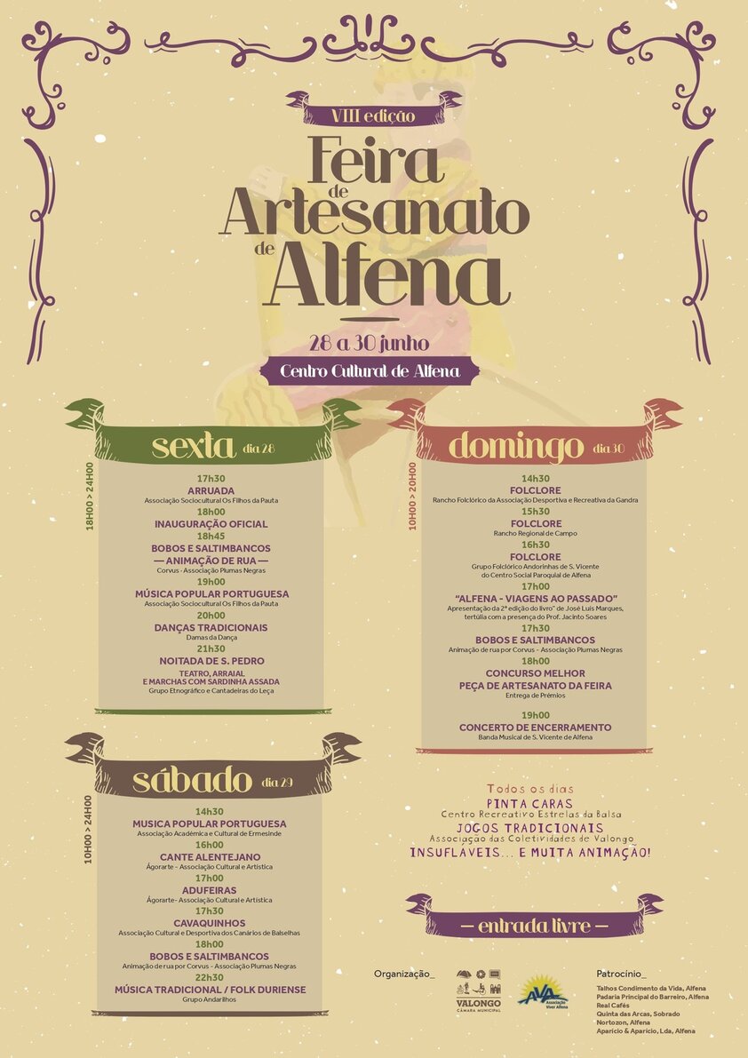 A VIII Edição da Feira de Artesanato de Alfena realiza-se de 28 a 30 de junho, no Centro Cultural de Alfena. São três dias repletos de animação com muita música, dança, diversões, jogos tradicionais, gastronomia e belos trabalhos de artesanato! O programa inclui também o concurso de melhor peça de artesanato do certame. A entrada é livre e gratuita.