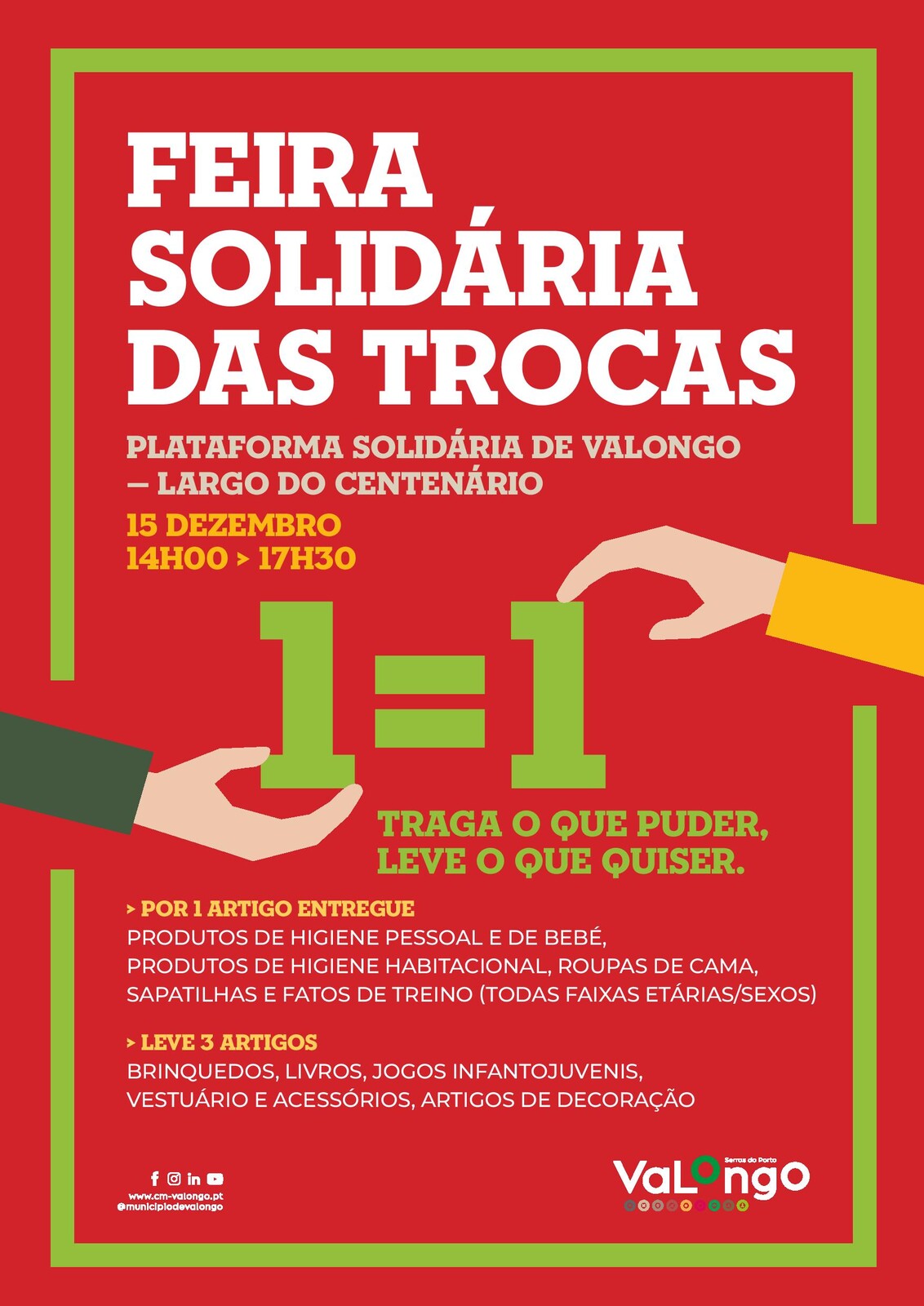 No próximo dia 15 de dezembro, entre as 14h e as 17h30, a Plataforma Solidária, em pleno Largo do Centenário, vai, uma vez mais, organizar uma Feira Solidária das Trocas. Trata-se de um projeto de apoio às famílias mais carenciadas da concelho que consiste na entrega de um produto (produtos de higiene pessoal e de bebé, roupa de cama, sapatilhas e fatos de treino unixeso e de todos os tamanhos) e na recolha de três (brinquedos, livros, jogos infantojuvenis, vestuário, acessórios e artigos de decoração).