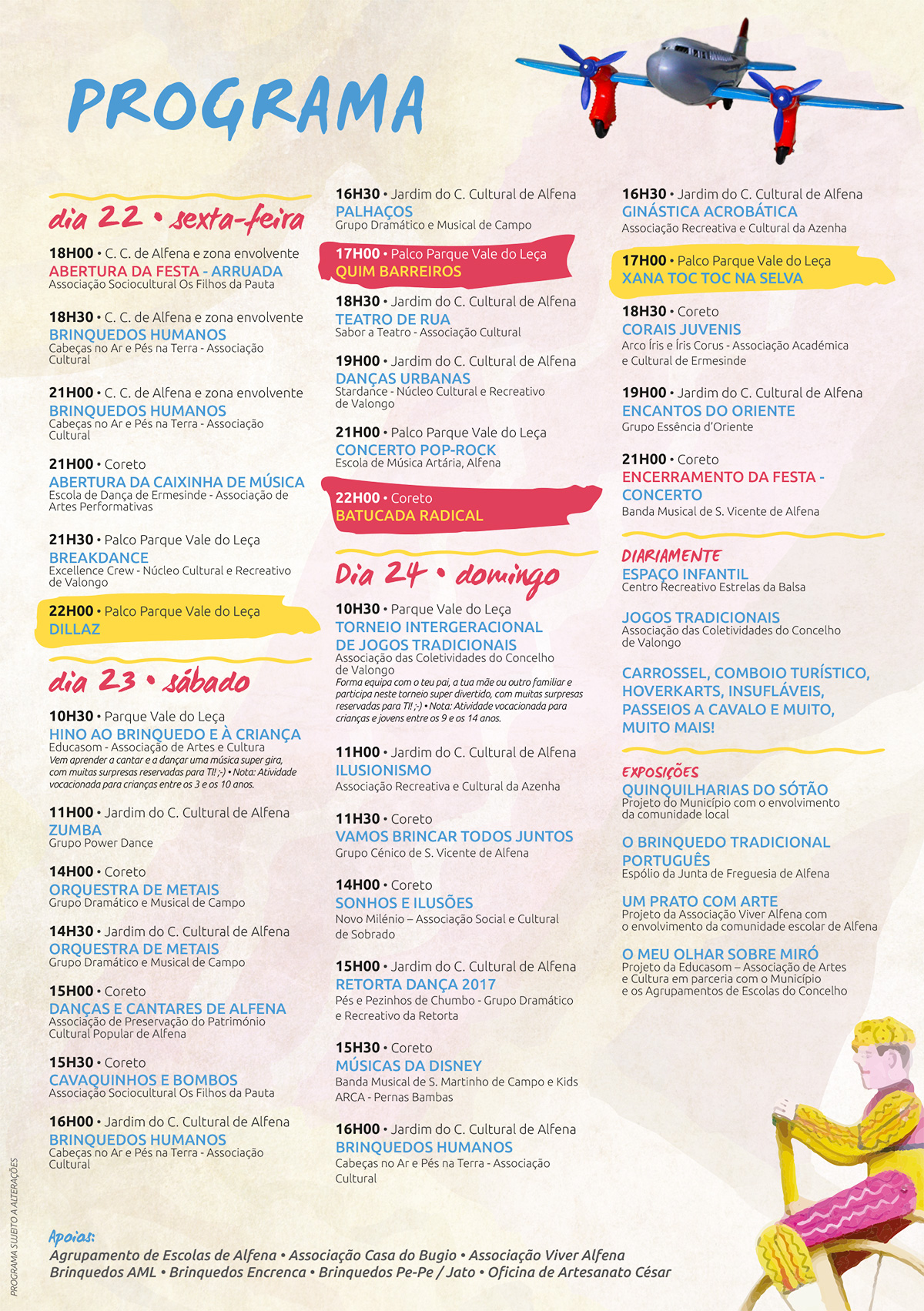 Além dos cabeças de cartaz da edição de 2017 (Dillaz, Quim Barreiros e Xana Toc Toc), o programa de animação inclui variadíssimos espetáculos das associações locais e ainda museus convidados, colecionismo, exposições, oficinas, atividades lúdicas (jogos didáticos, insufláveis, jogos tradicionais, etc.), artesanato e gastronomia típica de Valongo, onde não faltarão os famosos biscoitos e regueifa de Valongo.
