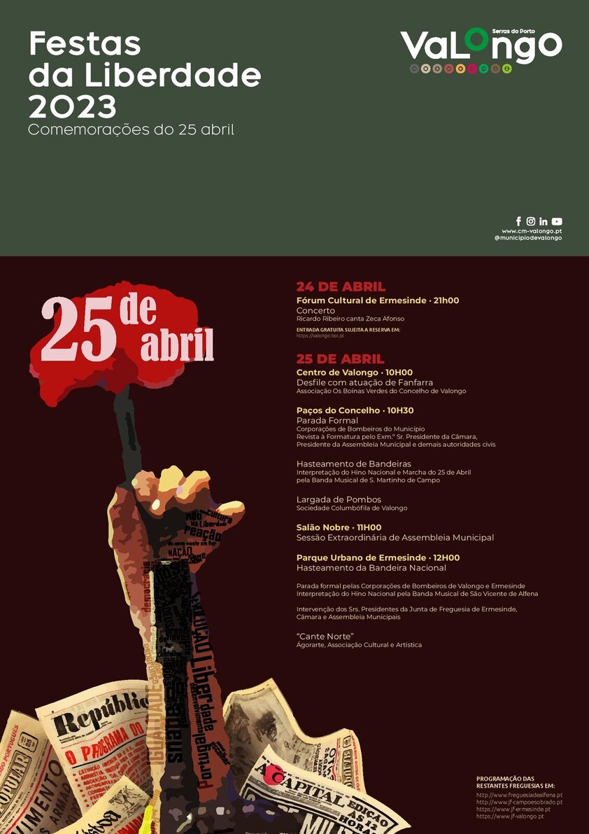 Cumprindo a tradição, o município de Valongo volta a assinalar o 25 de abril com a realização de mais uma edição das Festas da Liberdade. Assim, nos dias 24 e 25, decorrerão inúmeras atividades destinadas a celebrar uma das mais importantes datas da história do país.