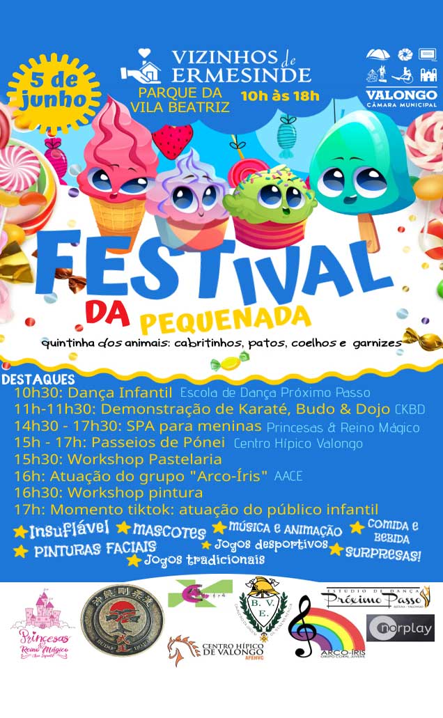 A Associação "Vizinhos de Ermesinde" promove o evento Festival da Pequenada, no espaço exterior do Parque da Vila Beatriz, em Ermesinde, no dia 5 de junho de 2022.