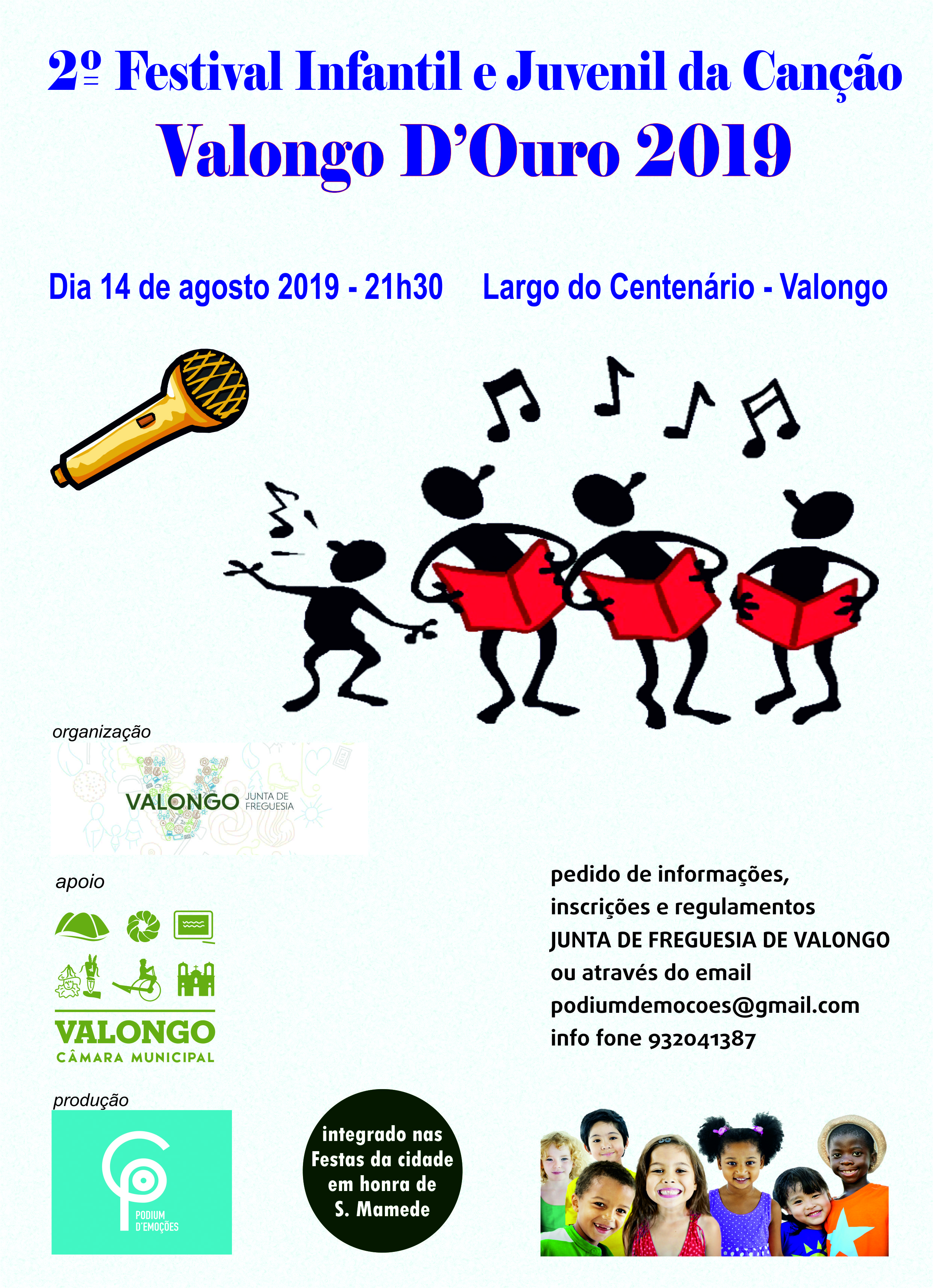 A Junta de Freguesia de Valongo, com apoio da Câmara Municipal de Valongo, promove a segunda edição do Festival Infantil e Juvenil Valongo D’Ouro 2019. Haverá dois escalões de concorrentes, infantis dos 6 aos 12 e juvenis dos 13 aos 18 e dois tipos de concurso: originais e versões.
