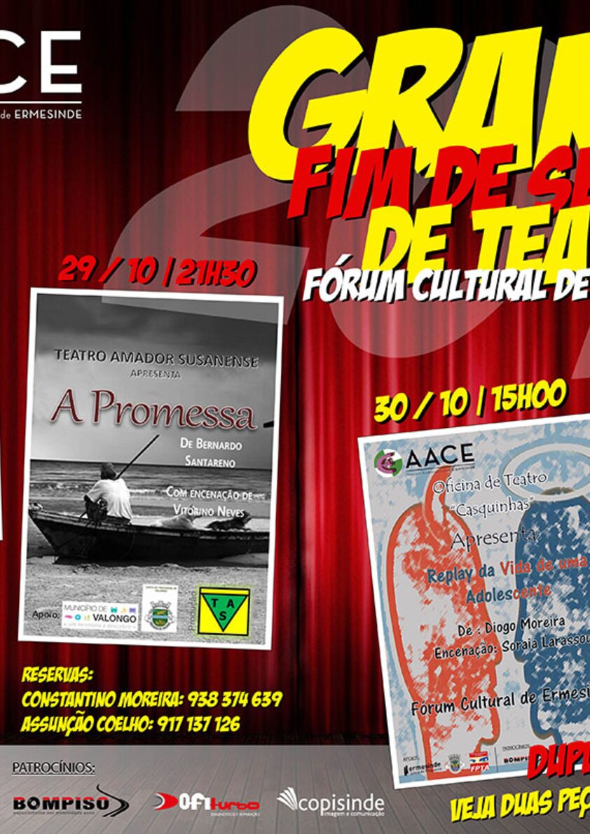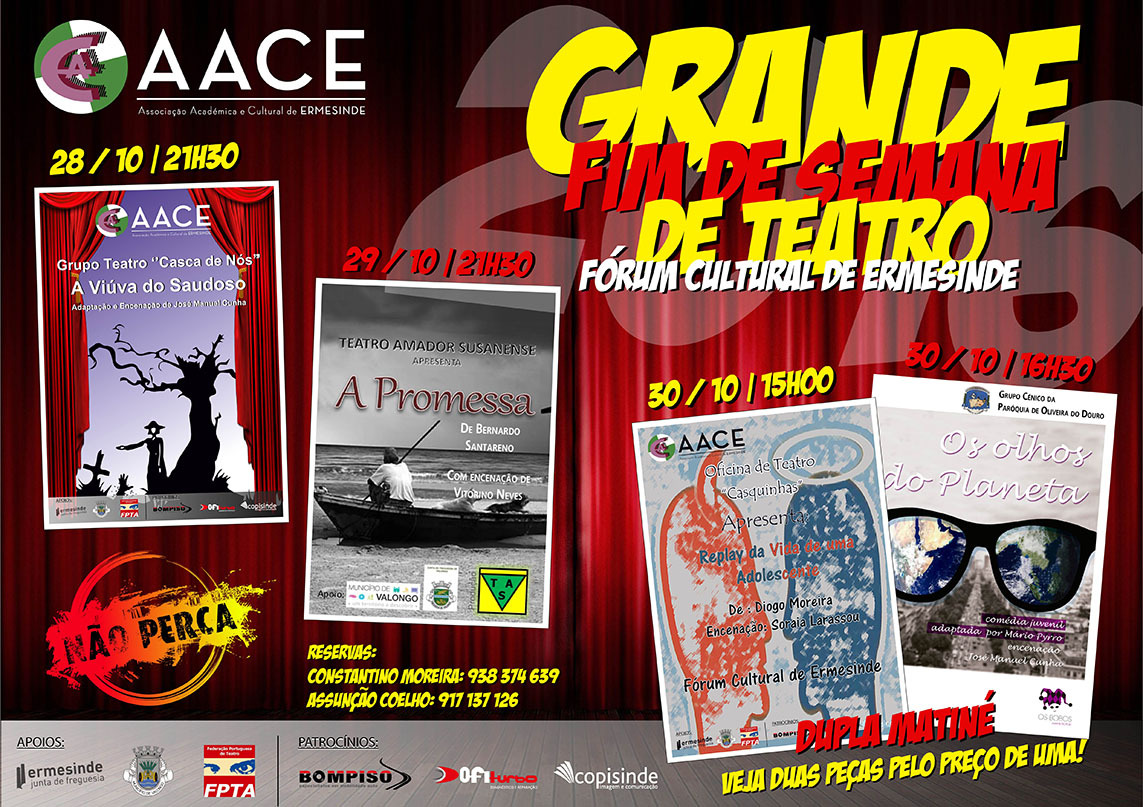 Nos dias 28, 29 e 30 de outubro, o Fórum Cultural de Ermesinde acolhe a iniciativa «Grande Fim de Semana de Teatro», uma iniciativa do grupo Casca de Nós da Associação Cultural e Académica de Ermesinde.