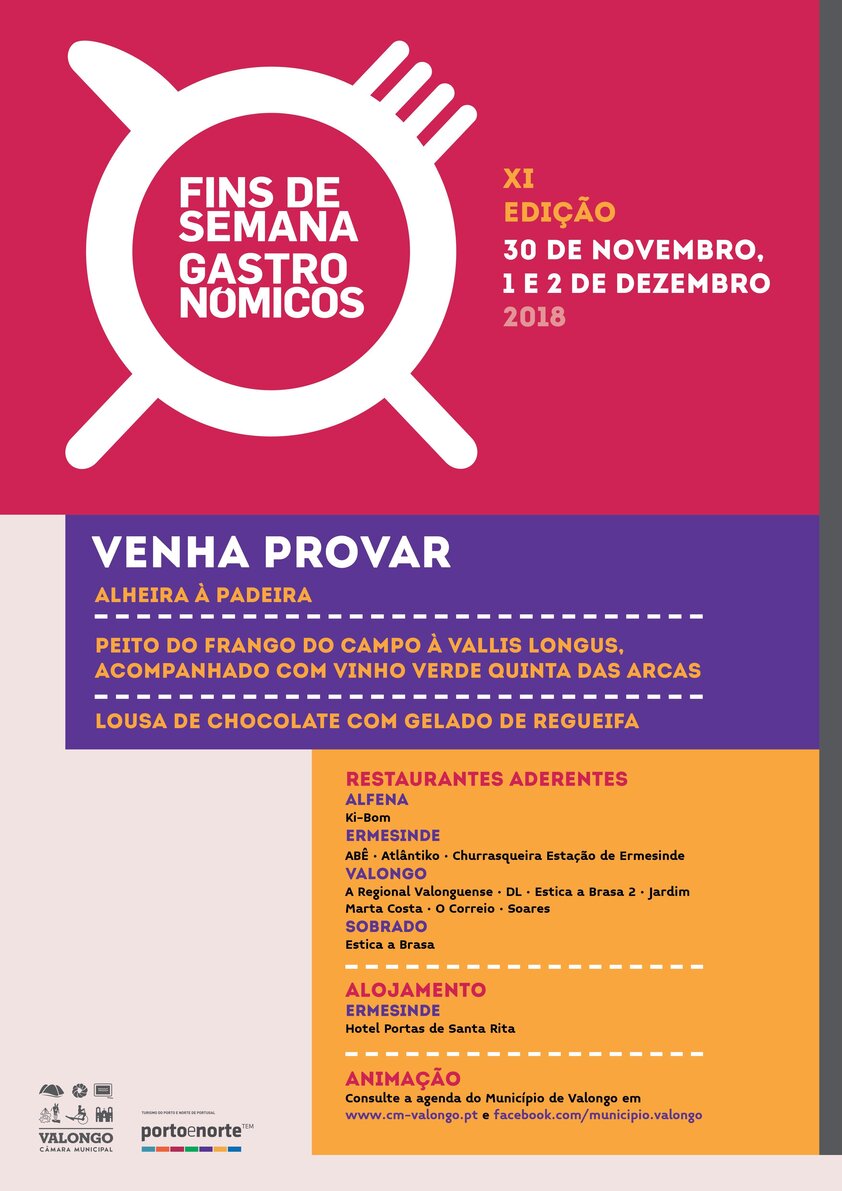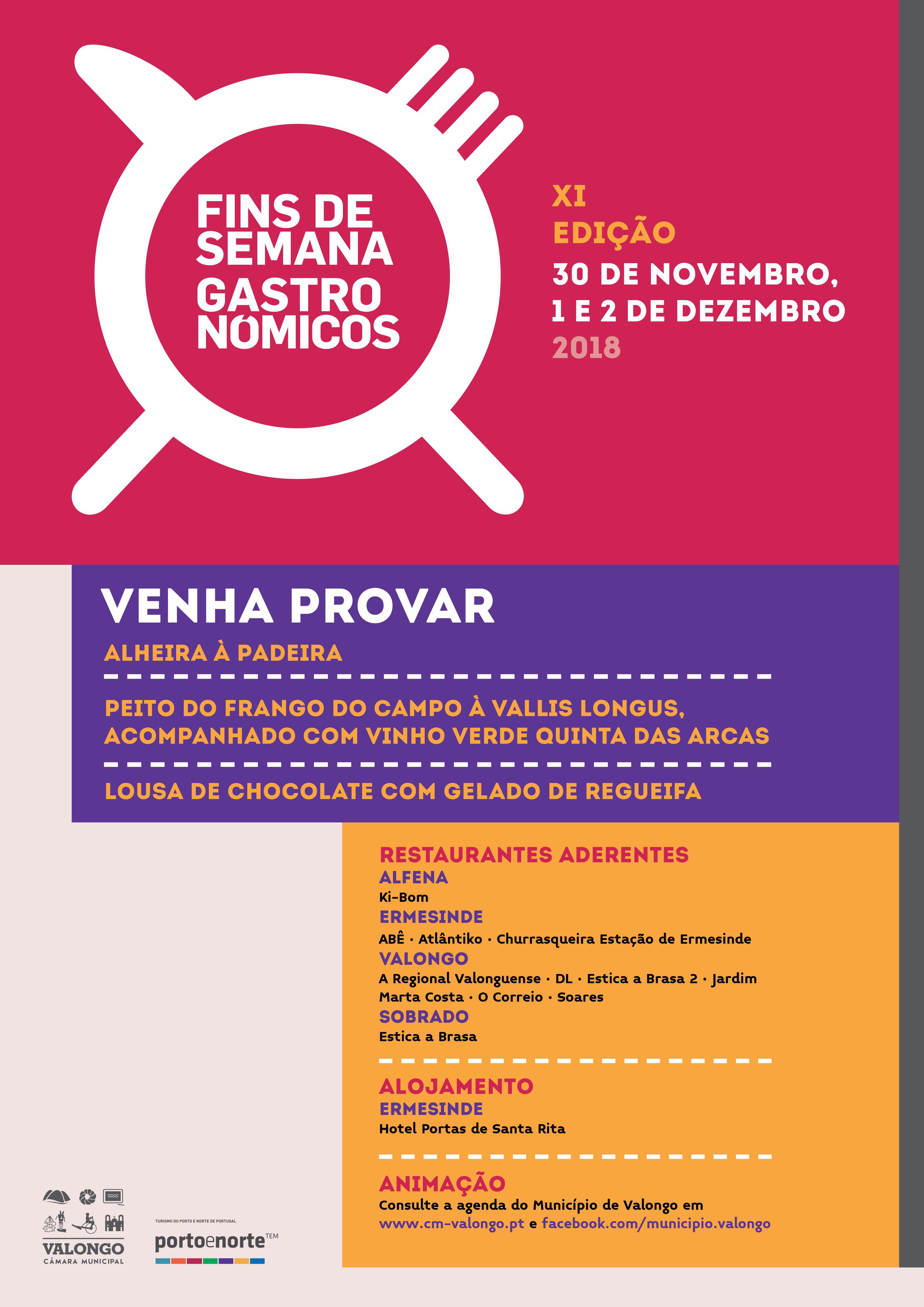 A Turismo do Porto e Norte de Portugal (TPNP) vai realizar mais uma edição dos Fins de Semana Gastronómicos, iniciativa que decorrerá de novembro de 2018 a maio de 2019, abrangendo todas as refeições compreendidas entre o jantar de sexta-feira e o almoço de domingo. O evento decorre em Valongo nos dias 30 de novembro, 1 e 2 de dezembro, nos restaurantes e na unidade de alojamento aderentes, permitindo provar e conhecer as iguarias do PROVE VALONGO, projecto desenvolvido ao longo do ano de 2017 com a APHORT, restaurantes e pastelarias do concelho, que visou encontrar novas receitas / pratos inovadores inspirados nas nossas tradições, resultando em novas criações constituídas por entrada, prato principal e sobremesa.