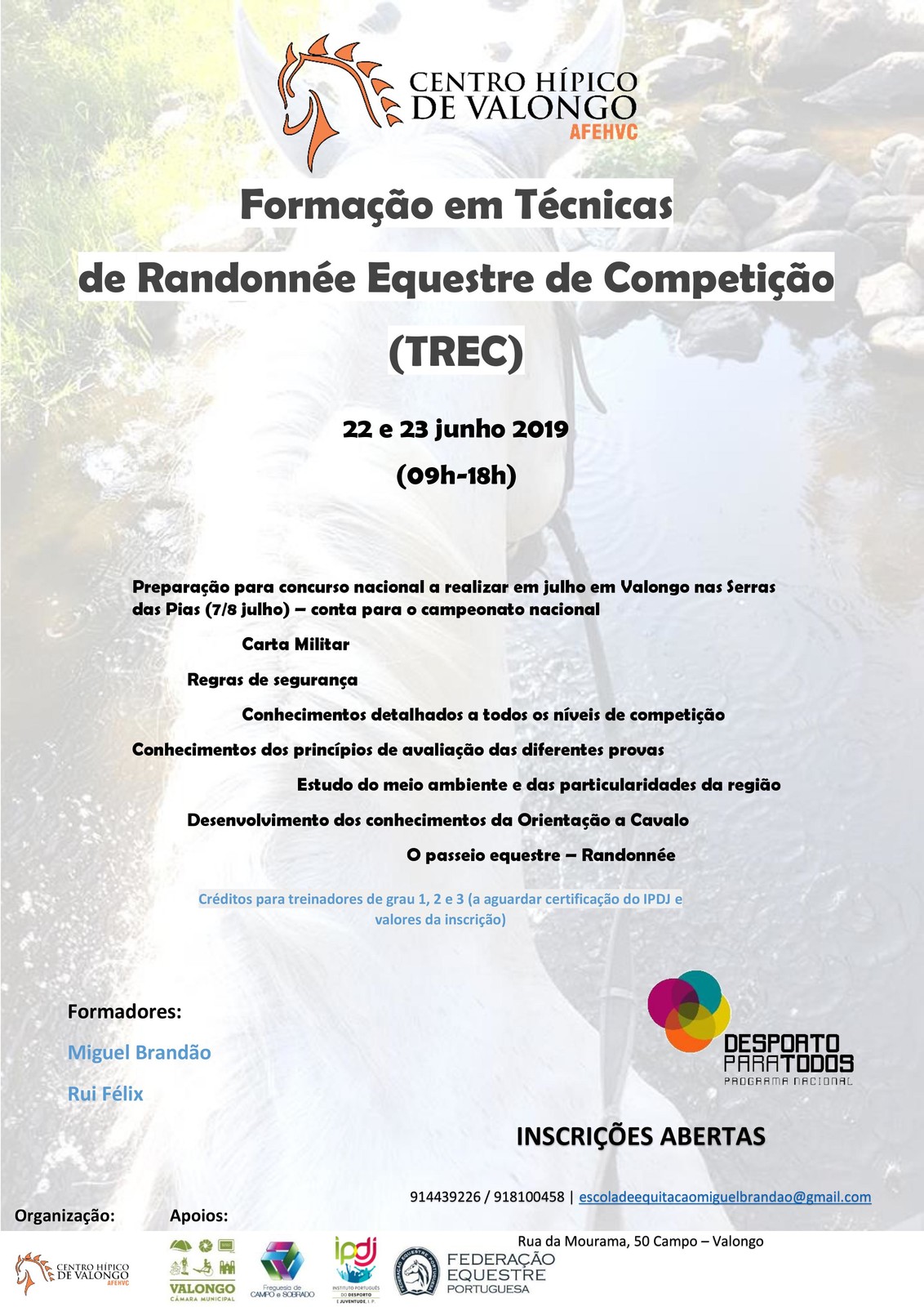 A Academia de Formação Equestre e Hipoterapia de Valongo e Campo, com o apoio do Município de Valongo, irá realizar uma formação de preparação para o Concurso Nacional de TREC, nos dias 22 e 23 de junho, das 09h00 às 18h00, no Centro Hípico de Valongo, tendo como formadores Miguel Brandão e Rui Félix, com os seguintes conteúdos: