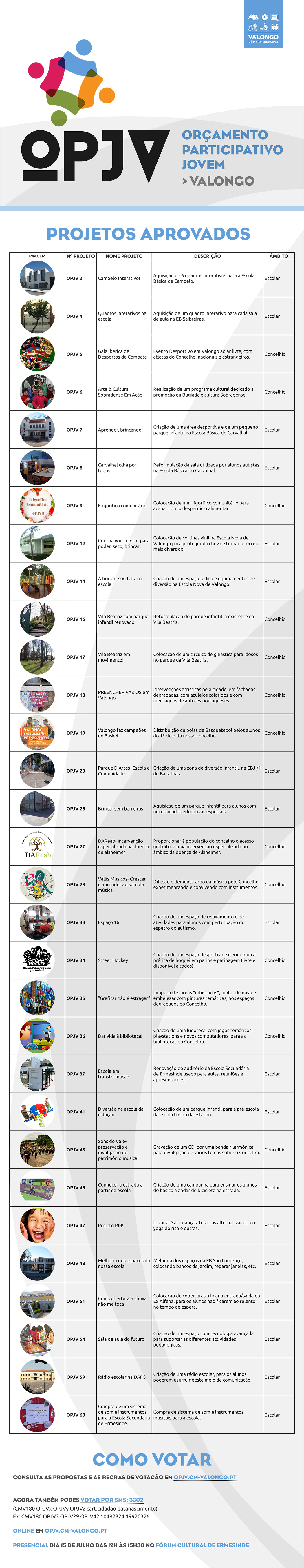 Em 2016, o Município de Valongo colocou-se na vanguarda deste tipo de procedimento tendo criado, para o efeito, uma plataforma informática disponível através do endereço http://opjv.cm-valongo.pt, para os proponentes entregarem as suas propostas e exercerem o seu direito de voto. Em 2017, a grande inovação foi a possibilidade dos jovens votarem gratuitamente através de SMS.