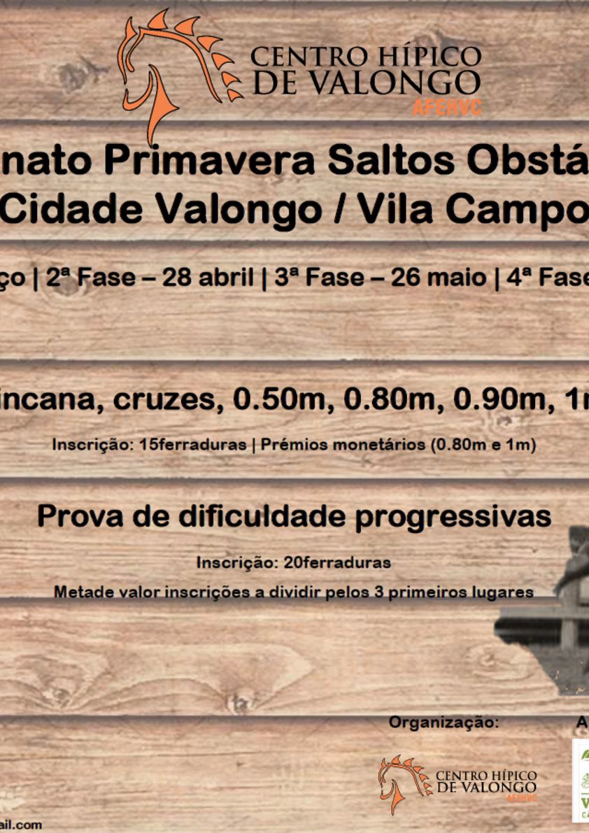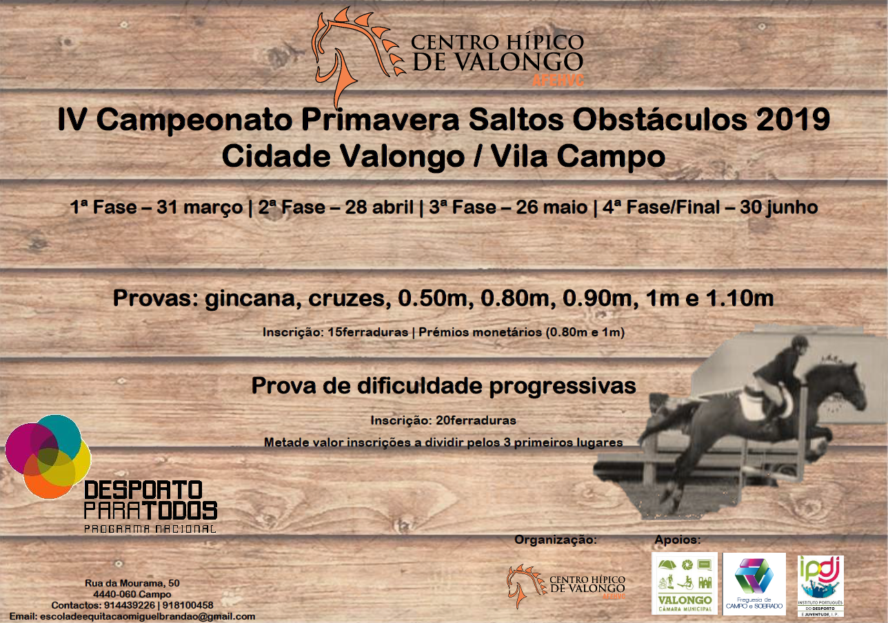 A Academia de Formação Equestre e Hipoterapia de Valongo e Campo - AFEHVC, com o apoio do Município de Valongo, irá levar a efeito no dia 28 de abril a 2.ª fase do IV Campeonato Primavera Saltos Obstáculos 2019, envolvendo provas de gincana, cruzes, 0.80m, 0.90m, 1.00m e 1.10m, com a participação de atletas de todo o país.
