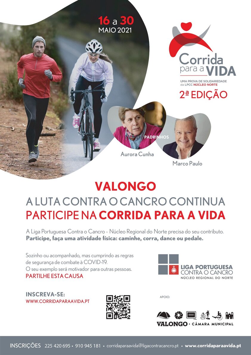 A Liga Portuguesa Contra o Cancro - Núcleo Regional do Norte @LPCCNorte com o apoio do Município de Valongo, realiza a 2ª edição da CORRIDA PARA A VIDA, uma prova desportiva solidária a favor dos doentes oncológicos. Este ano o evento conta com dois padrinhos muito conhecidos do público e vencedores do cancro, como símbolos de luta e esperança, a ex-atleta Aurora Cunha e o cantor Marco Paulo.