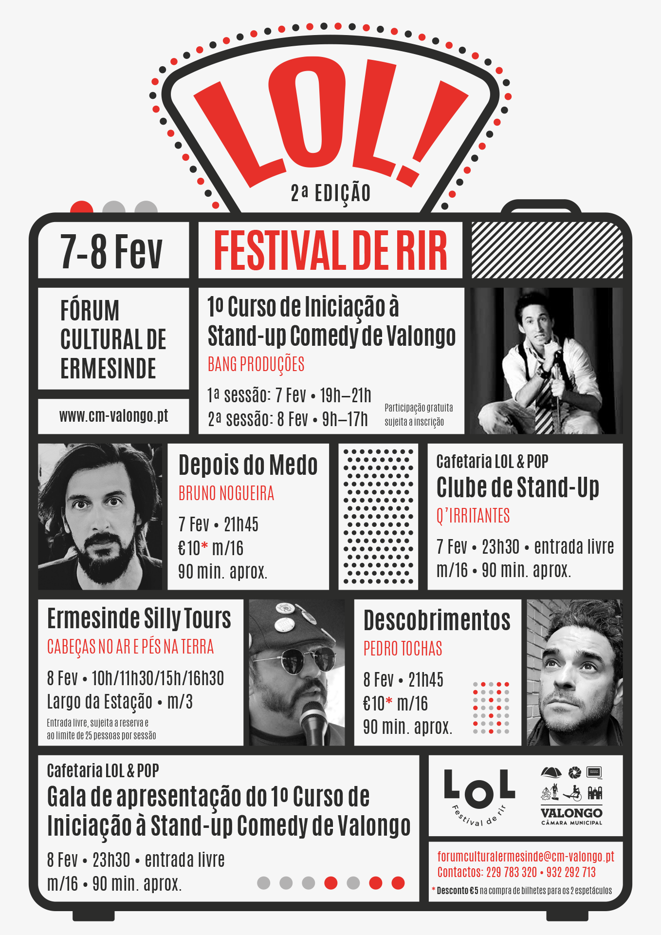 A 2ª edição do «LOL! – Festival de RiR» vai decorrer em Ermesinde nos próximos dias 07 e 08 de fevereiro. Este ano a programação vai assentar maioritariamente no stand-up comedy. Vamos levar o festival à rua com visitas turísticas cómicas e ao Fórum Cultural de Ermesinde, oferecendo espetáculos de qualidade. Haverá também um espaço formativo e um novo espaço de convívio bem-disposto e, principalmente, de encontro entre pessoas: o «LOL & POP - Club de Stand-Up».