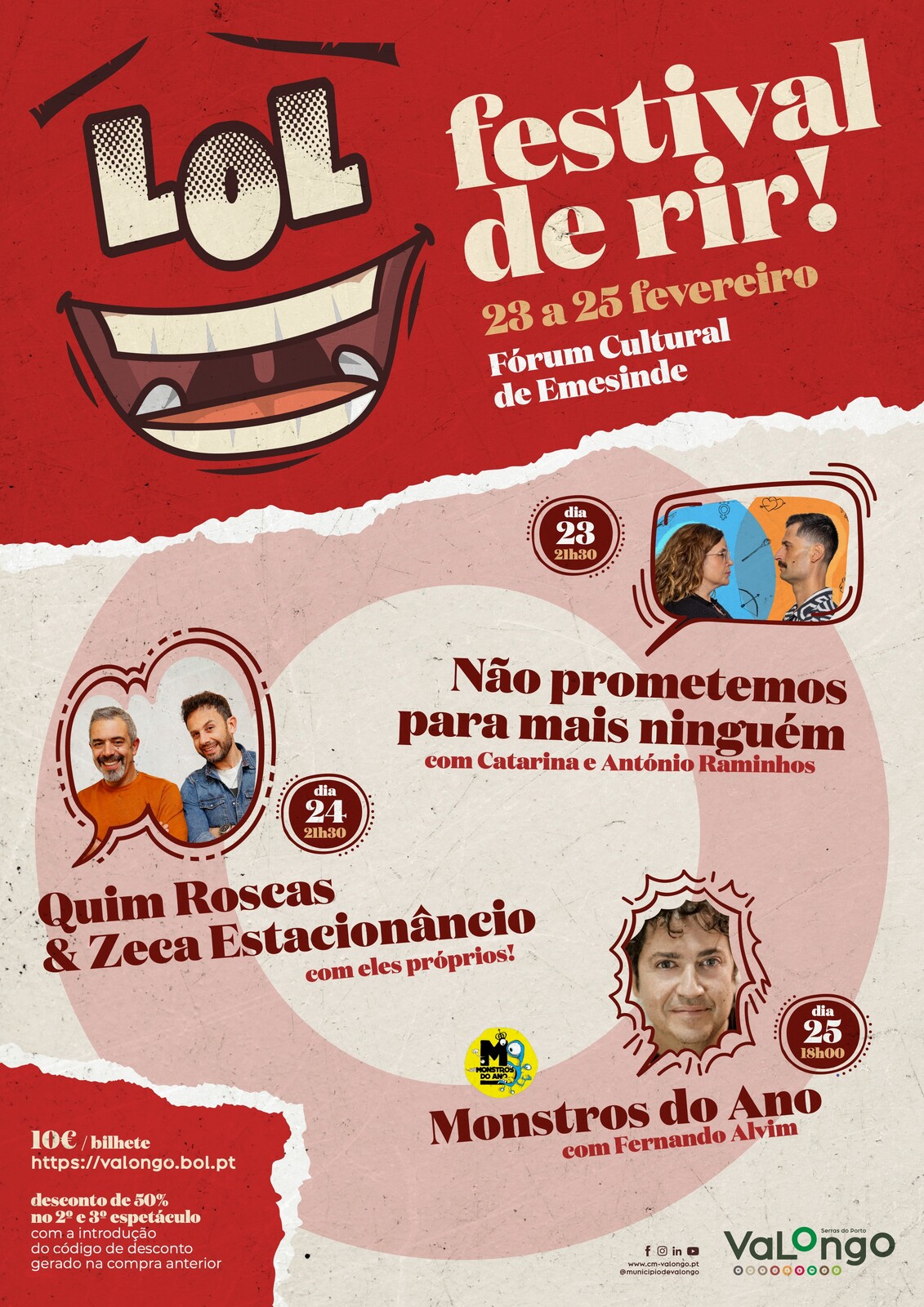 Os bilhetes podem ser adquiridos em https://valongo.bol.pt . Desconto de 50% no 2º e 3º espetáculo com a introdução do código de desconto gerado na compra anterior.