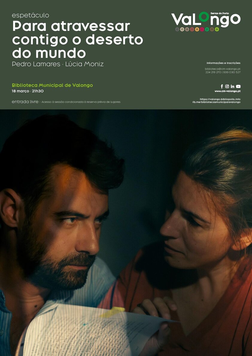 No âmbito das comemorações do Dia Mundial da Poesia, a Biblioteca Municipal de Valongo acolhe “Para atravessar contigo o deserto do mundo”, um espetáculo criado e interpretado por Pedro Lamares e Lúcia Moniz, a partir da amizade e das cartas trocadas entre Sophia de Mello Breyner Andresen e Jorge de Sena.