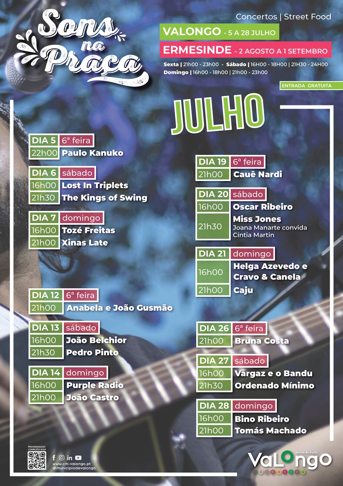 Durante o mês de julho, aproveitando as tardes e noites de verão, o Largo do Centenário, em Valongo, vai acolher vários artistas locais e emergentes de grande qualidade, que irão animar o público, num ambiente que se pretende de bom convívio ao ar livre, acompanhado de boa gastronomia.
