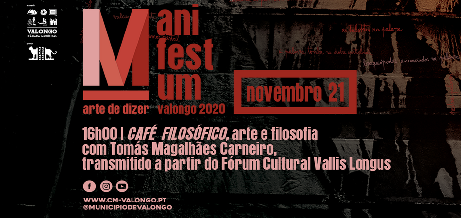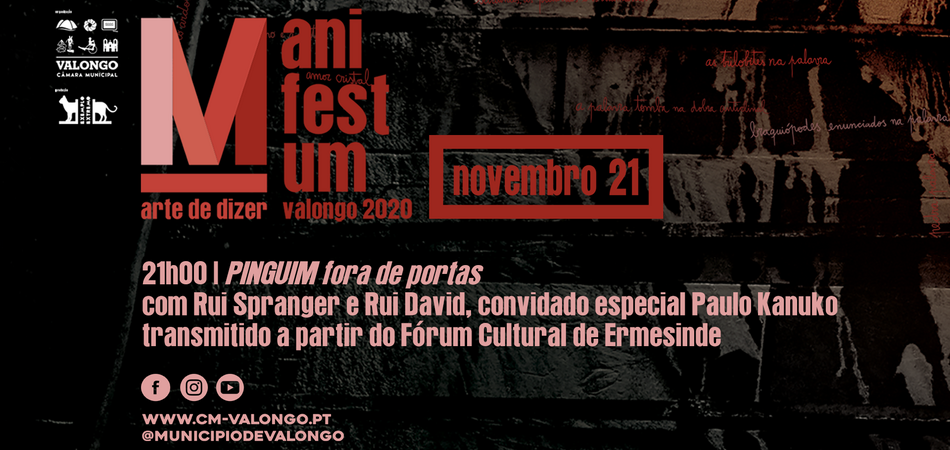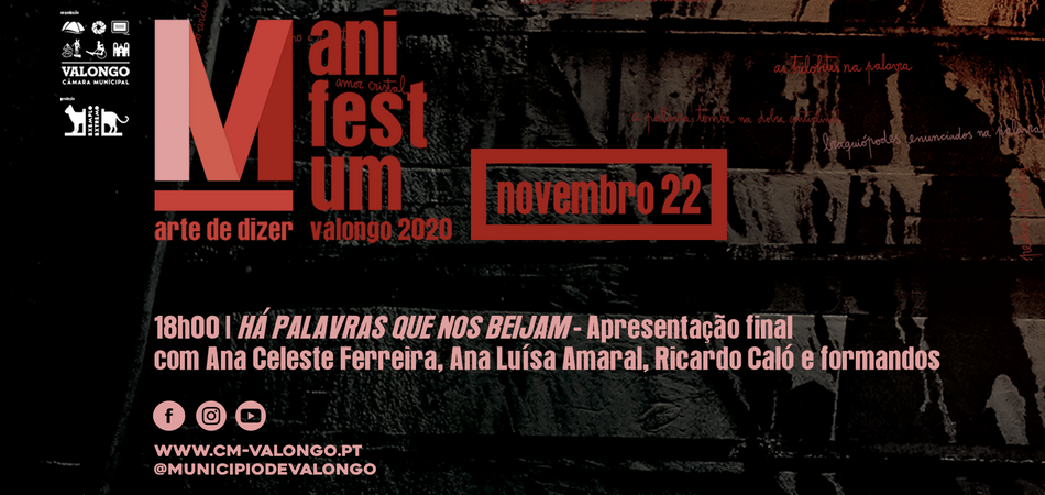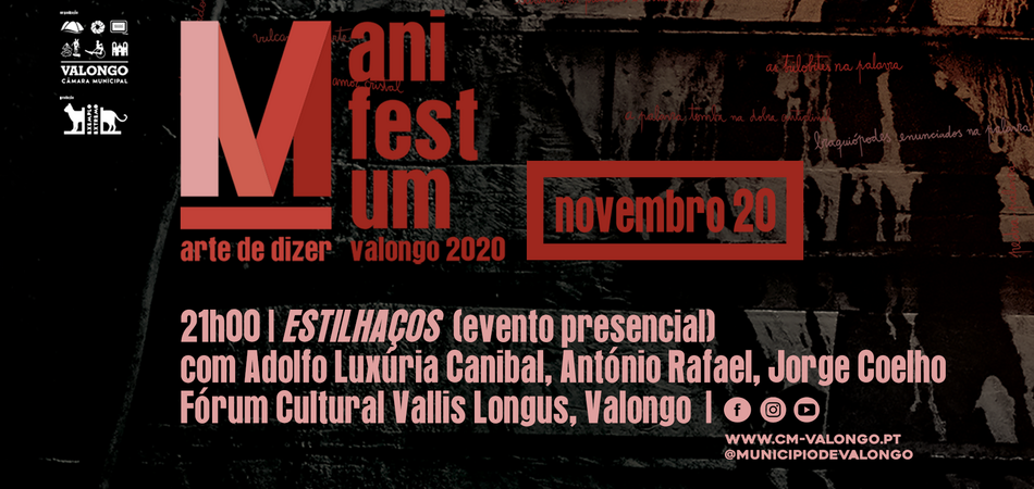 A PALAVRA é de novo o território certo do MANIFESTUM arte de dizer. A edição de 2020 comporta conteúdos audiovisuais, conversas, laboratórios, concertos, intervenções poéticas interativas, nos formatos online nas redes sociais do Município de Valongo e ao vivo no Fórum Cultural Vallis Longus.