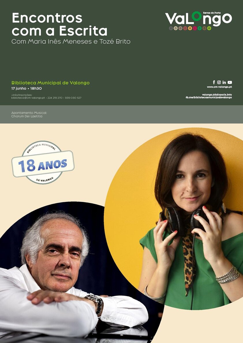 No âmbito das comemorações do seu 18.º aniversário, a Biblioteca Municipal de Valongo promove mais um "Encontros com a Escrita". Os convidados desta edição, que acontece no dia 17 de junho, pelas 18h30, são Maria inês Meneses e Tozé Brito.