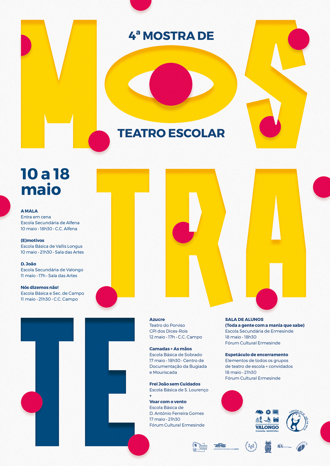 A MOSTRA TE - Mostra de Teatro Escolar é a parte mais visível e pública do trabalho que é feito ao longo do ano escolar junto dos alunos e alunas dos clubes de teatro, no âmbito do projeto do Município de Valongo Palco Letivo. Dinamizada pela companhia profissional de Teatro Cabeças no Ar e Pés na Terra, esta iniciativa envolve não só os estudantes, mas também encarregados de educação e professores dos Agrupamentos de Escolas de Alfena, de Campo, de Ermesinde, de S. Lourenço, de Vallis Longus e de Valongo, num total de 8 Clubes de Teatro.