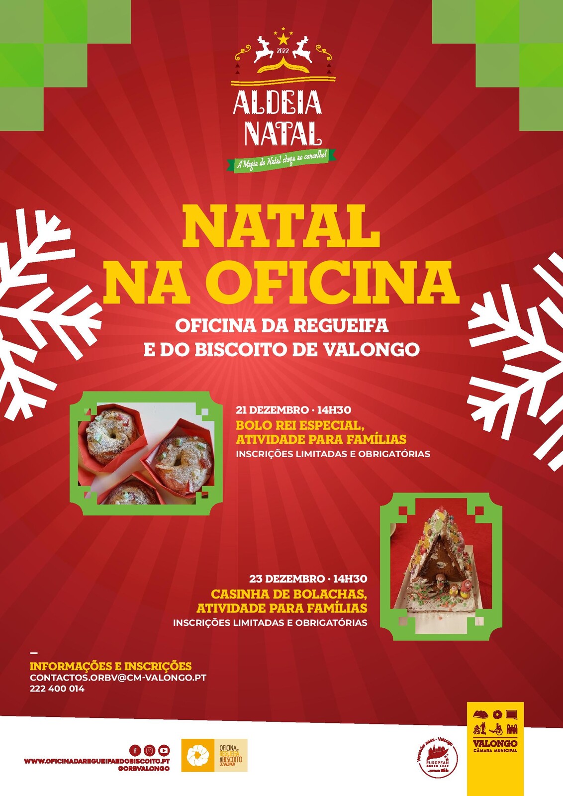 A Oficina da Regueifa e do Biscoito de Valongo vai, no âmbito das iniciativas destinadas a assinalar o Natal, promover dois worksophs temáticos. Assim no dia 21 de dezembro, às 14h30, decorrerá a oficina "Bolo-rei especial", enquanto no dia 23, também às 14h30, será a vez da "Casinha de Chocolate". Trata-se de duas atividades dirigidas a famílias e prometem muita diversão e doçura quanto baste.